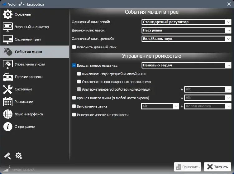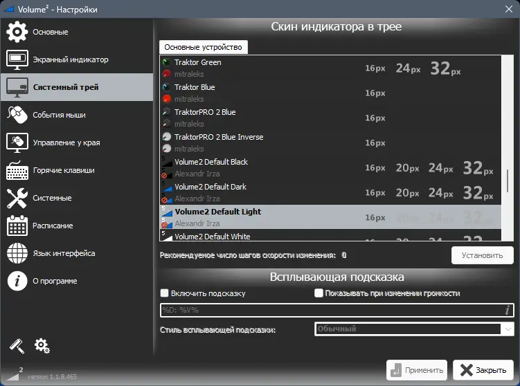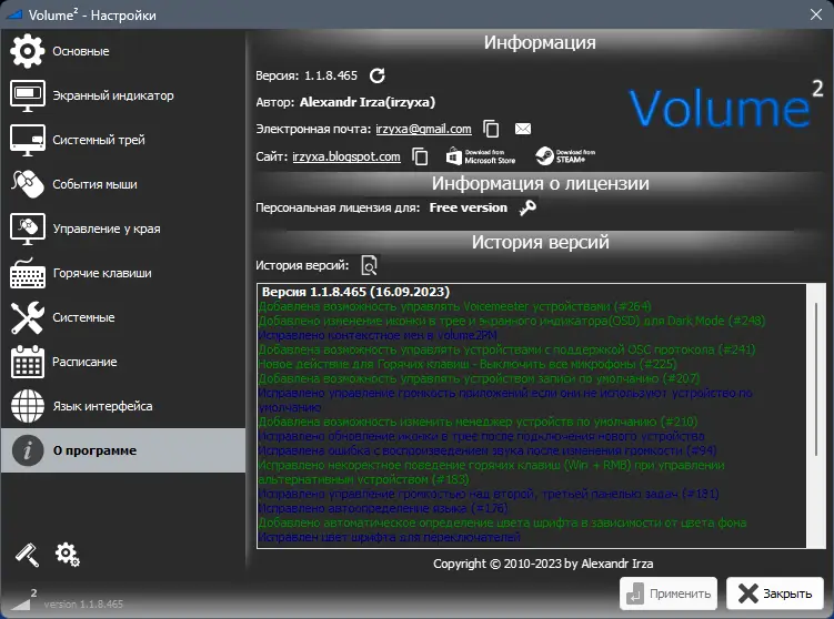 Volume² — это мощный и гибкий альтернативный регулятор громкости, который полностью заменяет стандартные средства Windows и предоставляет расширенные возможности настройки управления звуком и яркостью с помощью горячих клавиш и событий мыши.
