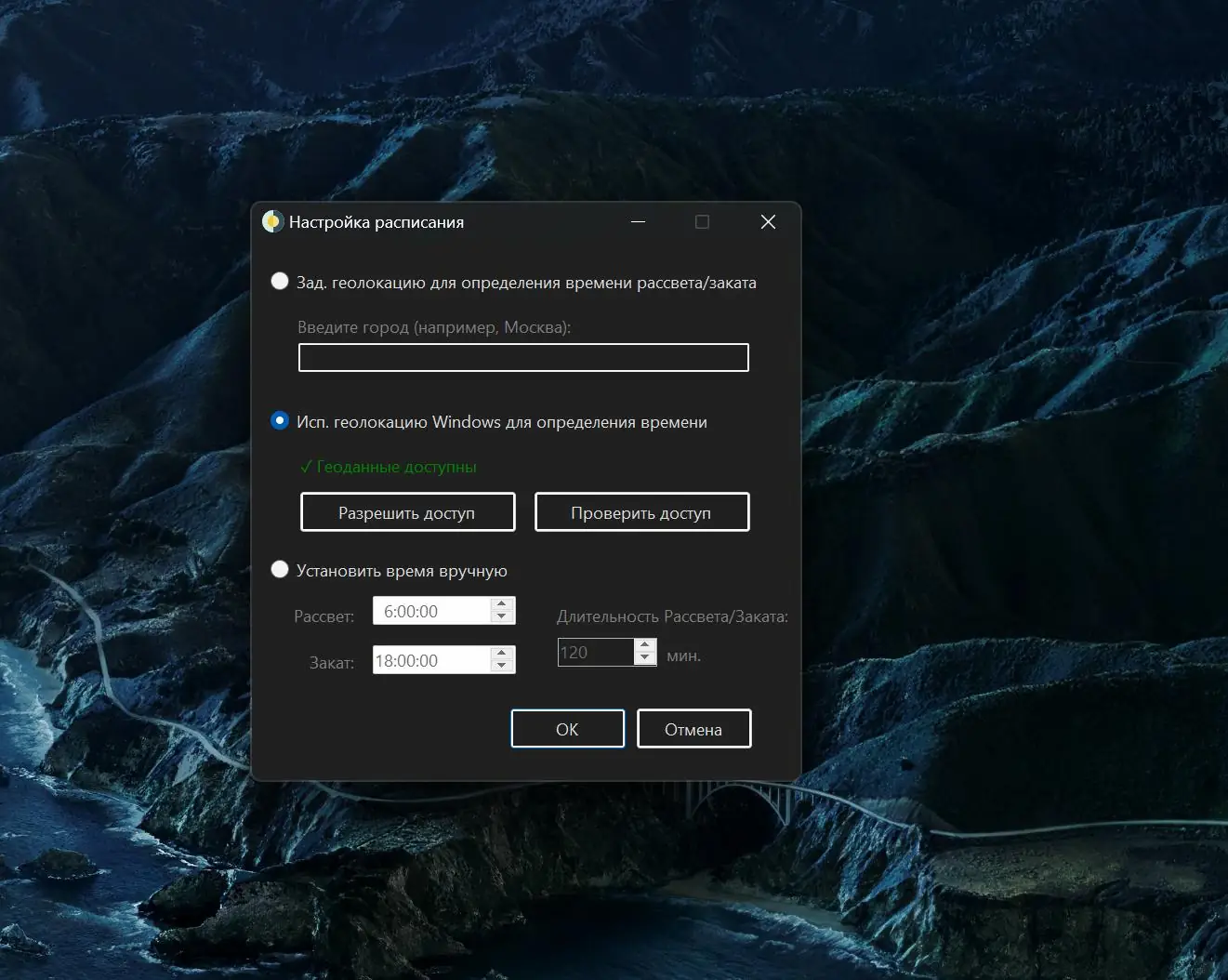 WinDynamicDesktop — это программа, которая предоставляет аналог динамических обоев macOS для системы Windows. Благодаря ей можно сделать рабочий стол более живым и гармоничным, меняющимся в зависимости от времени суток.