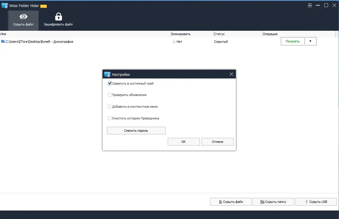 - Быстрое и лёгкое скрытие файлов и папок на любом носителе, включая USB-накопители.