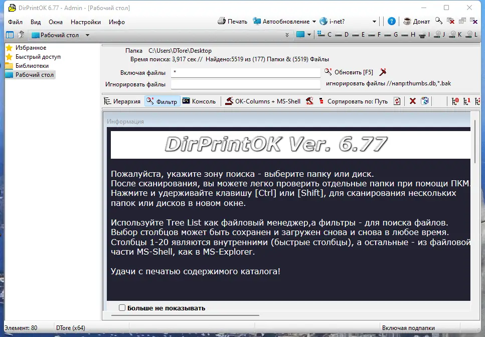 Данная программа представляет собой надёжный инструмент для фильтрации и печати содержимого каталогов с множеством полезных функций. Она подходит для пользователей, которым нужно оперативно просматривать и управлять файлами, а также создавать отчёты различных форматов.