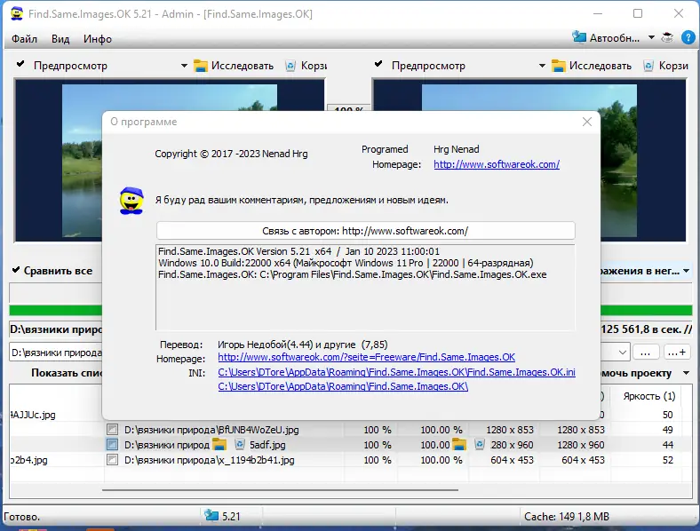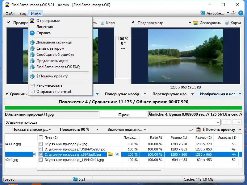 Find Same Images — это инновационное решение для поиска дубликатов и похожих изображений. В отличие от простых программ поиска дубликатов, эта система генерирует графические подписи и осуществляет сравнение по пикселям, учитывая даже повернутые, зеркальные или негативные версии изображений. Благодаря высокой производительности, программа способна выполнять более 100 000 сравнений в секунду при использовании одного ядра процессора, что значительно ускоряет работу при обработке больших коллекций фотографий или изображений в различных форматах, таких как JPEG, PNG, RAW и др.