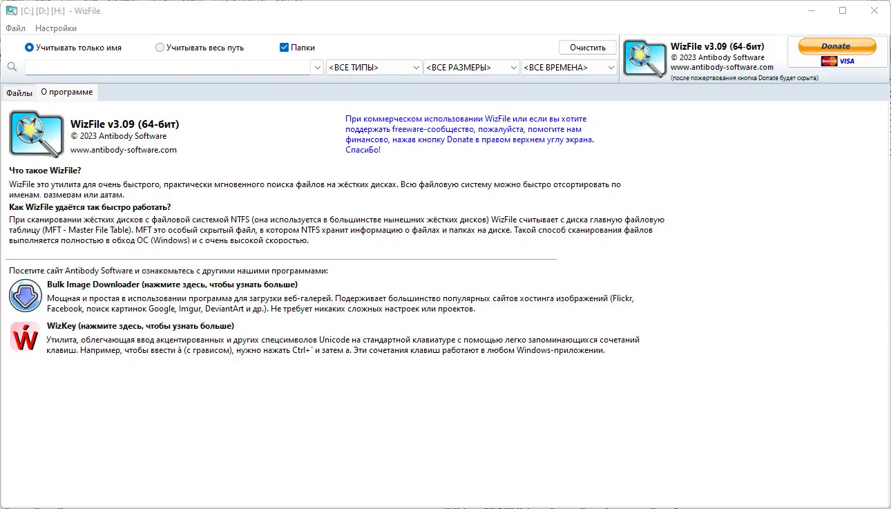 Эффективный инструмент для мгновенного нахождения файлов по названию или полному пути. WizFile быстро индексирует содержимое диска и отображает актуальные результаты в реальном времени. В числе возможностей — создание сложных поисковых запросов с использованием метасимволов, применение фильтров по типу файлов и отслеживание изменений на диске. Вся информация хранится в оперативной памяти, что обеспечивает высокую скорость работы без необходимости использования отдельной базы данных.