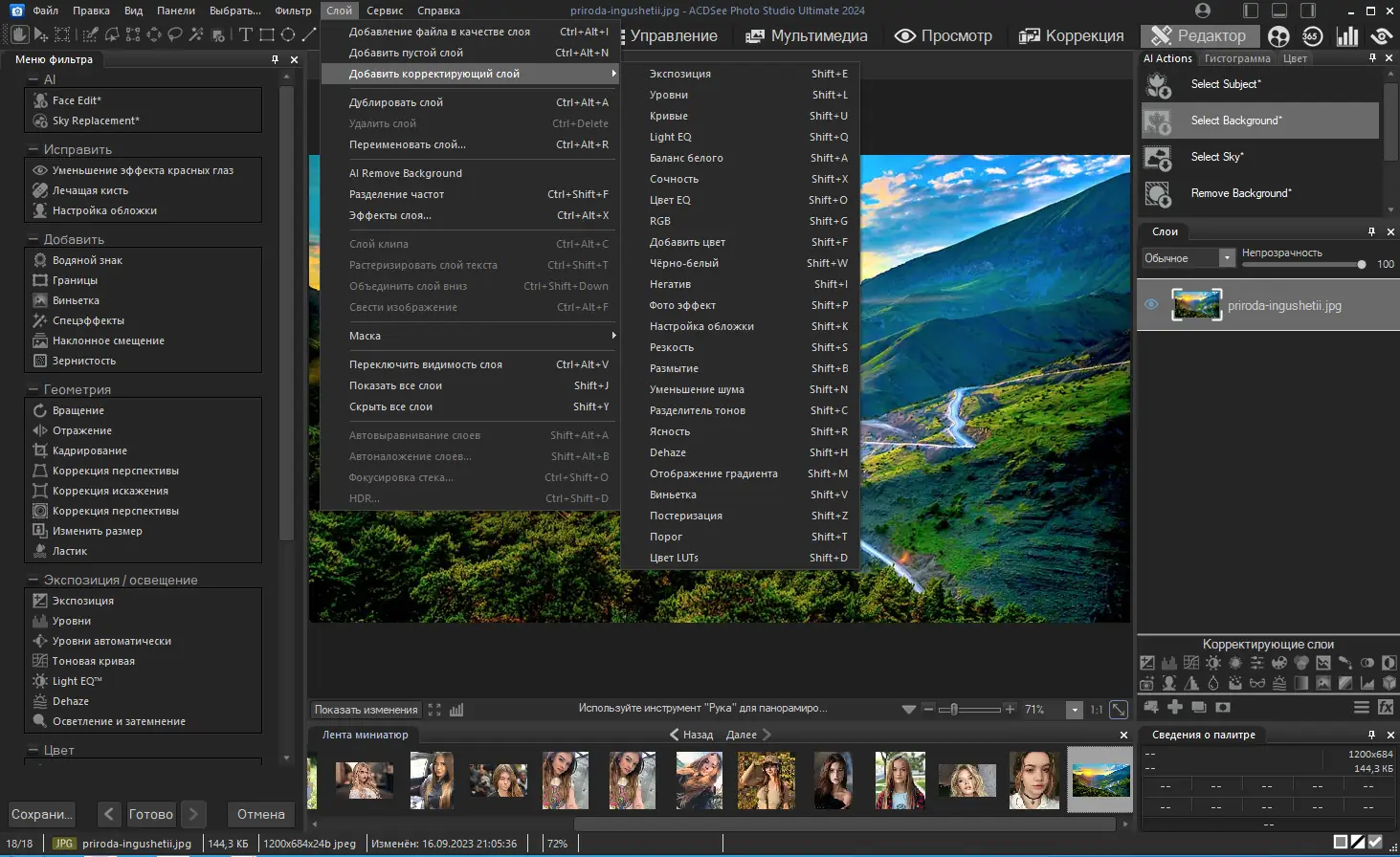 - Инновационные функции AI, такие как автоматическая замена неба, выделение объектов, исправление портретов и редактирование лиц.