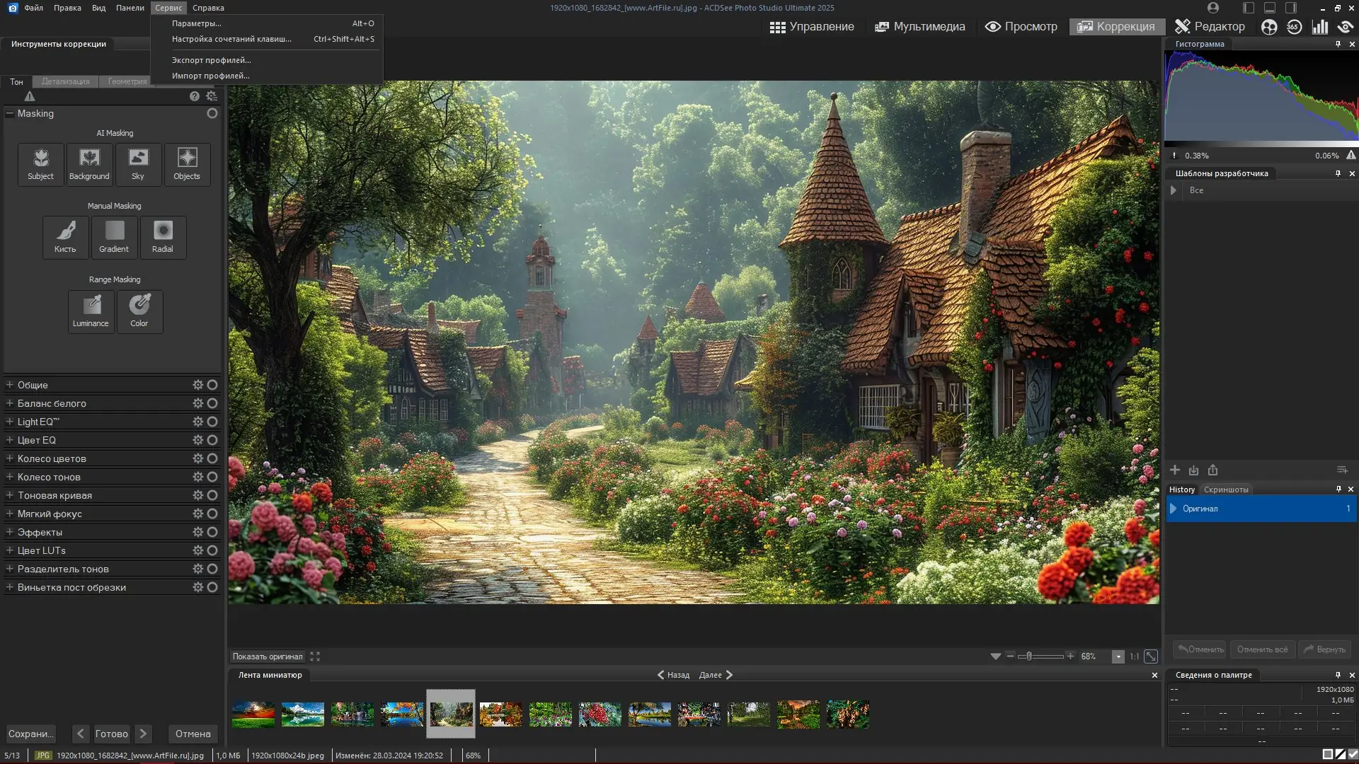 - Инструменты для точной коррекции баланса белого, устранения дефектов, повышения резкости и устранения помех.
