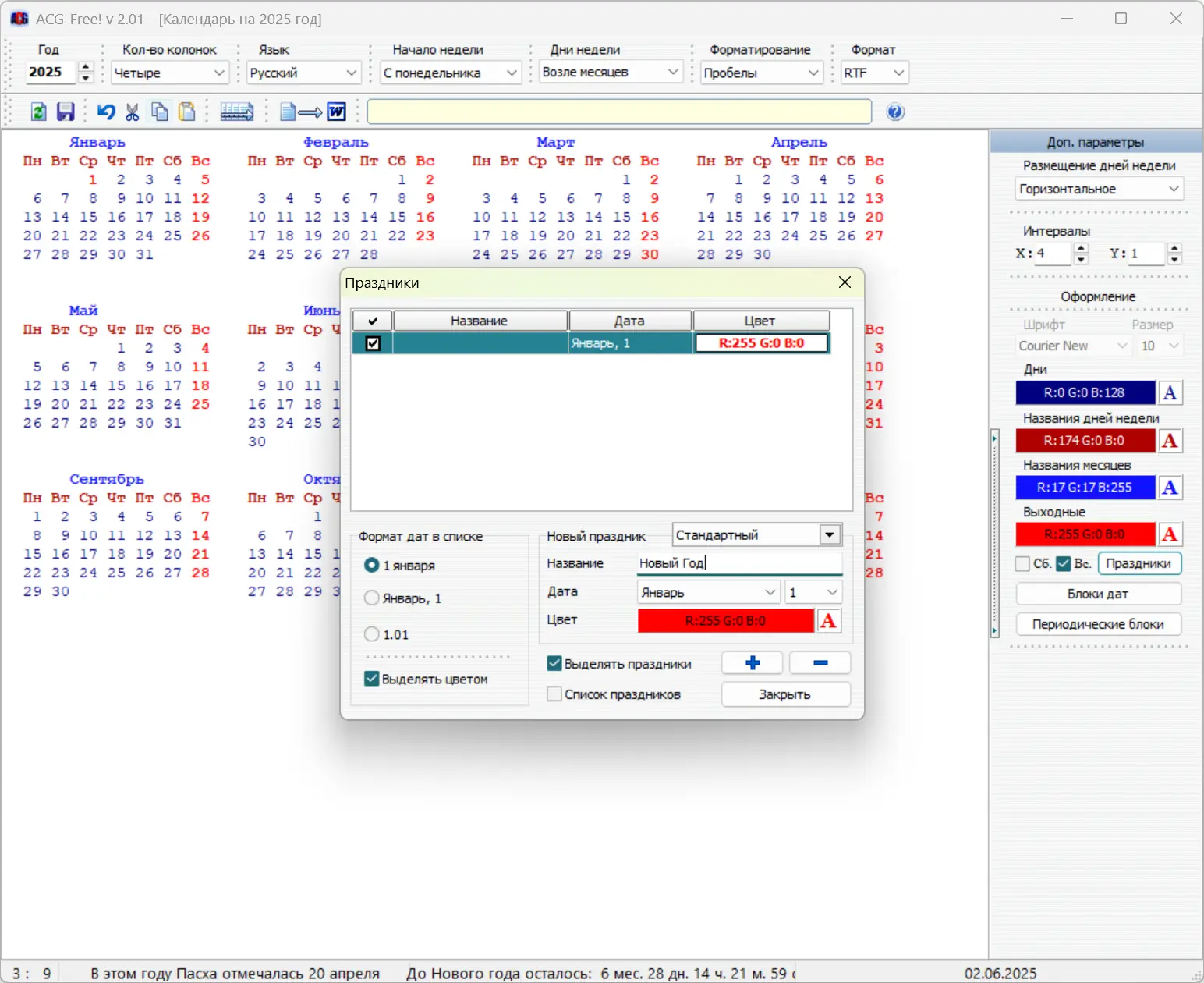- Редактор праздников, включая плавающие и специальные (по алгоритму) даты.
