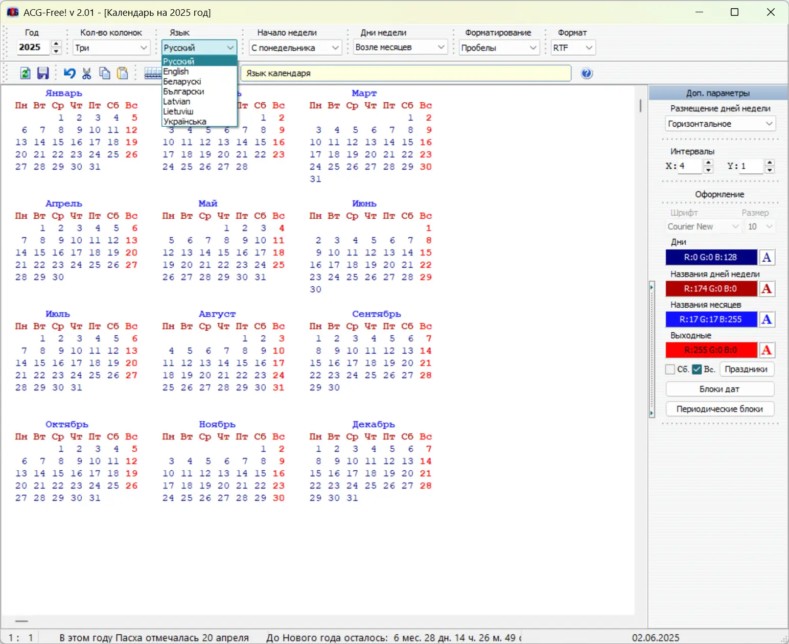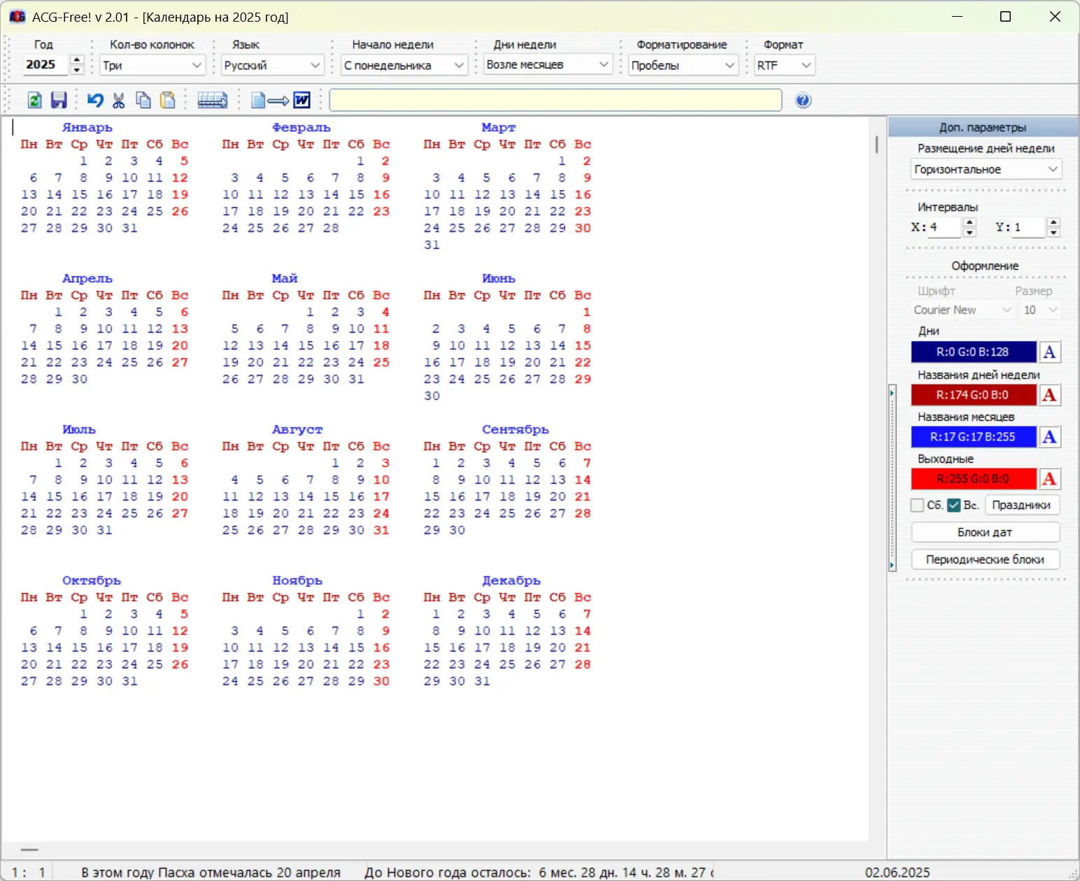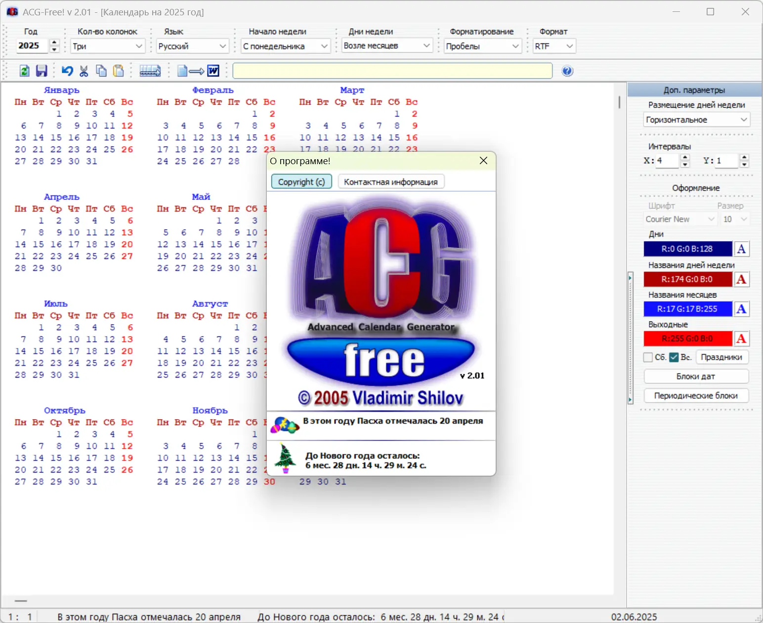 ACG-Free! 2.01 — это компактный и удобный инструмент для генерации календарей в текстовом формате. Не требует установки и занимает мало места на диске. Совместим с системами Windows 7, 8/8.1, 10 и 11 как на x32, так и на x64 битах. Программа подходит как для пользователей, нуждающихся в простых календарях, так и для веб-дизайнеров и верстальщиков, позволяя экспортировать календари в HTML, а также сохранять настройки в XML файле. Одним из ключевых преимуществ является возможность создавать календарь на любой год, от 1 до 9999 н.э., а также возможность автоматической раскраски дней, названий месяцев и праздников.