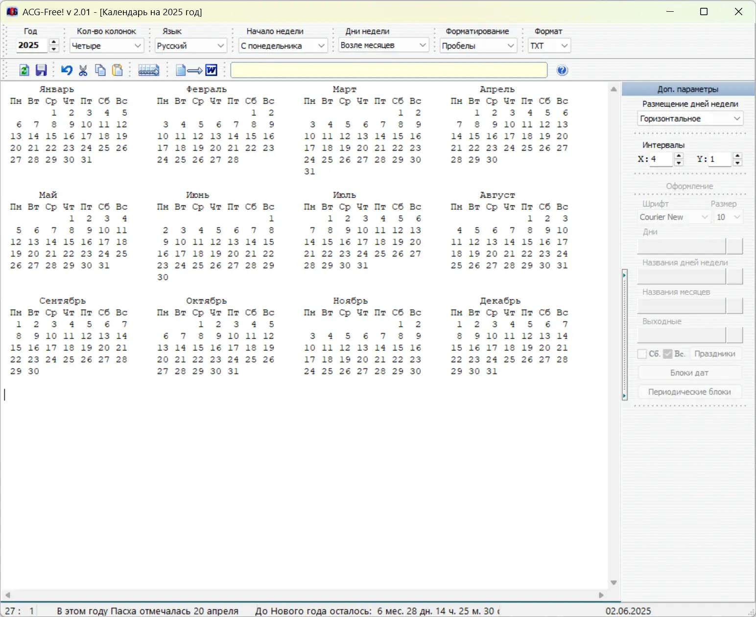 ACG-Free! — это простой и полностью бесплатный генератор календарей, который позволяет создавать текстовые календари для различных целей без необходимости использования сложных графических редакторов или коммерческих программ.
