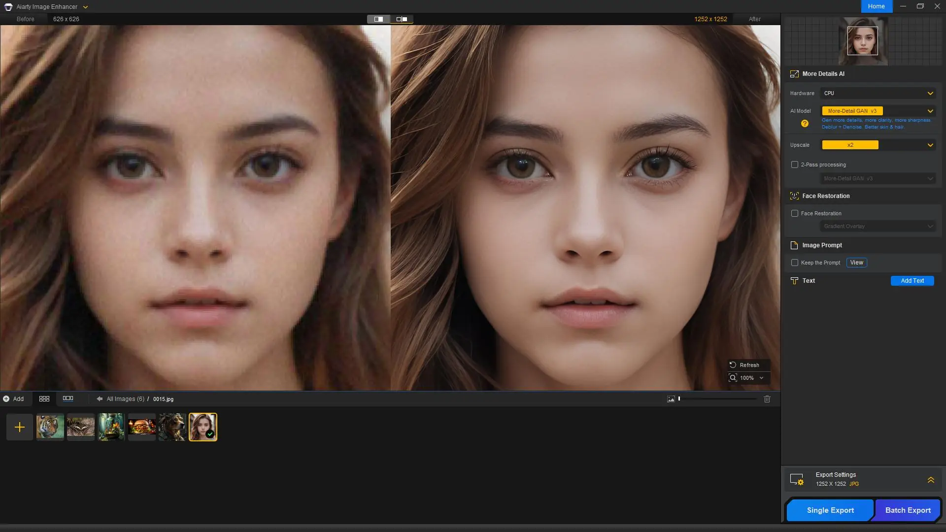 Aiarty Image Enhancer включает в себя три специализированные модели ИИ: для создания деталей, устранения дефектов и улучшения фотографий. Благодаря автоматическим функциям программа ускоряет обработку, а пакетная обработка до 100 изображений значительно экономит время. Удобный интерфейс и поддержка множества форматов делают её подходящим решением как для профессионалов, так и для новичков в сфере обработки изображений.