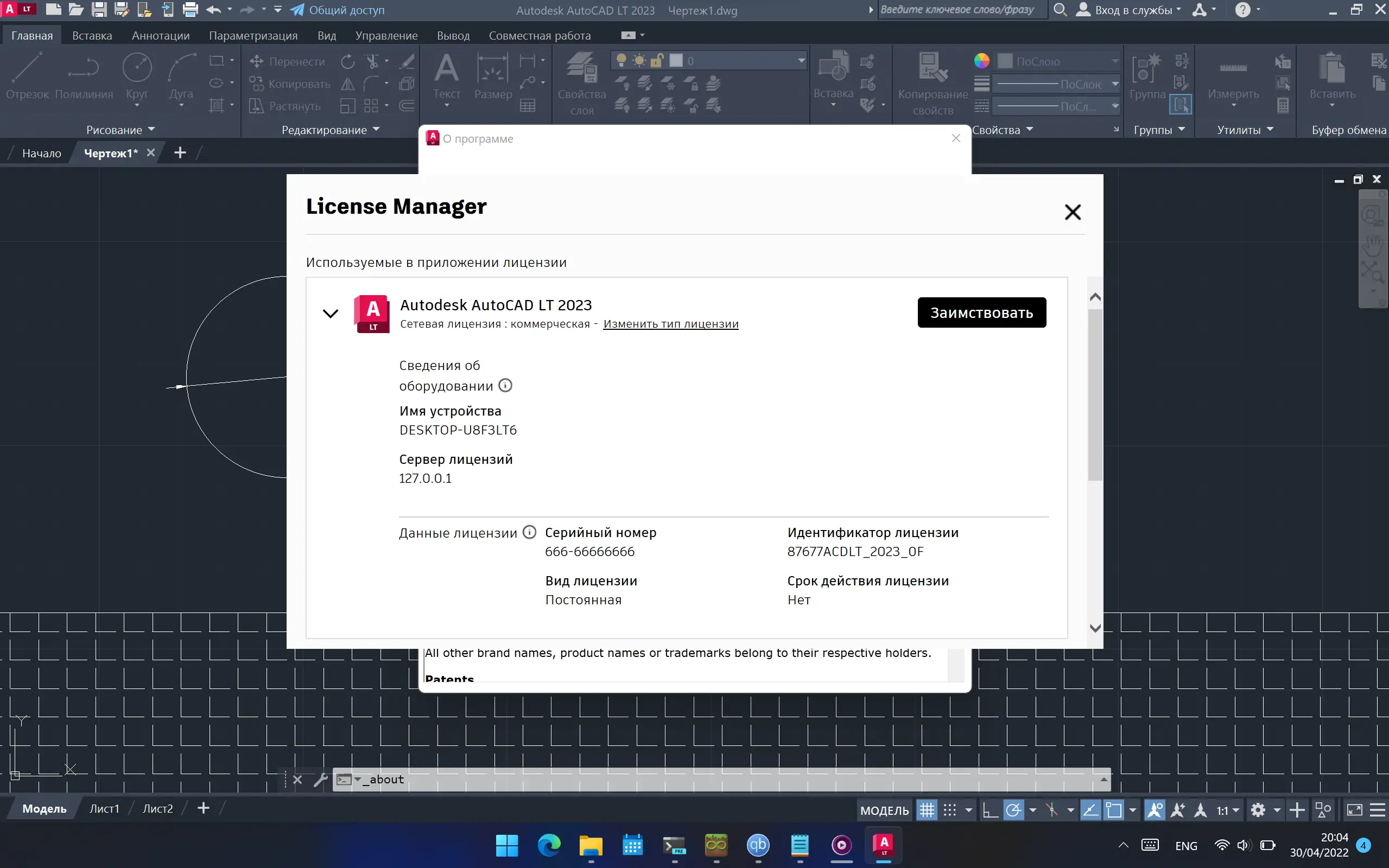 - Запустите AutoCAD LT и при запросе лицензии выберите «Использовать сетевую лицензию», указав в качестве сервера 127.0.0.1.