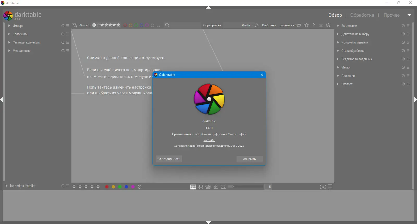 Darktable — это бесплатный фоторедактор с открытым исходным кодом, предназначенный для профессиональной организации и обработки фотоснимков, включая формат RAW. Программа позволяет выполнять полный цикл обработки изображений — от импорта и редактирования до экспорта и публикации — при этом обеспечивает высокую скорость работы и удобство интерфейса.