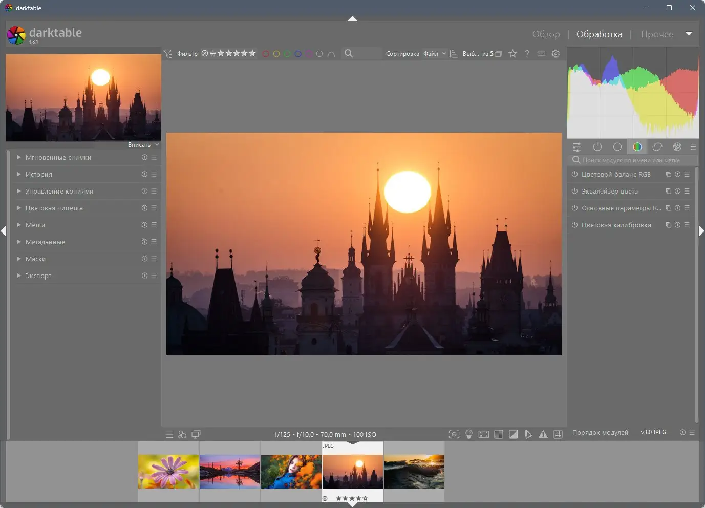 - Детальная коррекция и фильтрация изображений, включая резкость, шумоподавление и исправление хроматических аберраций