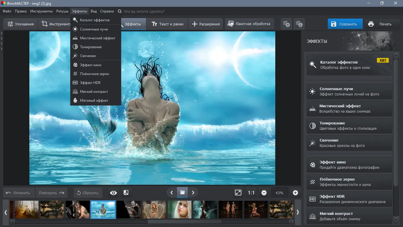 - Большая коллекция эффектов: тонирование, виньетирование, HDR, ретро и др. Для индивидуализации фотографий
