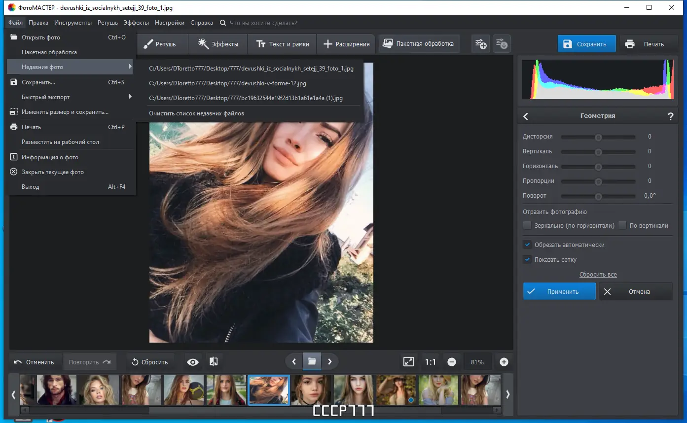 - Инструменты ретуши для создания безупречного портрета: устранение дефектов кожи, изменение цвета глаз, коррекция формы губ и прочие косметические коррекции.