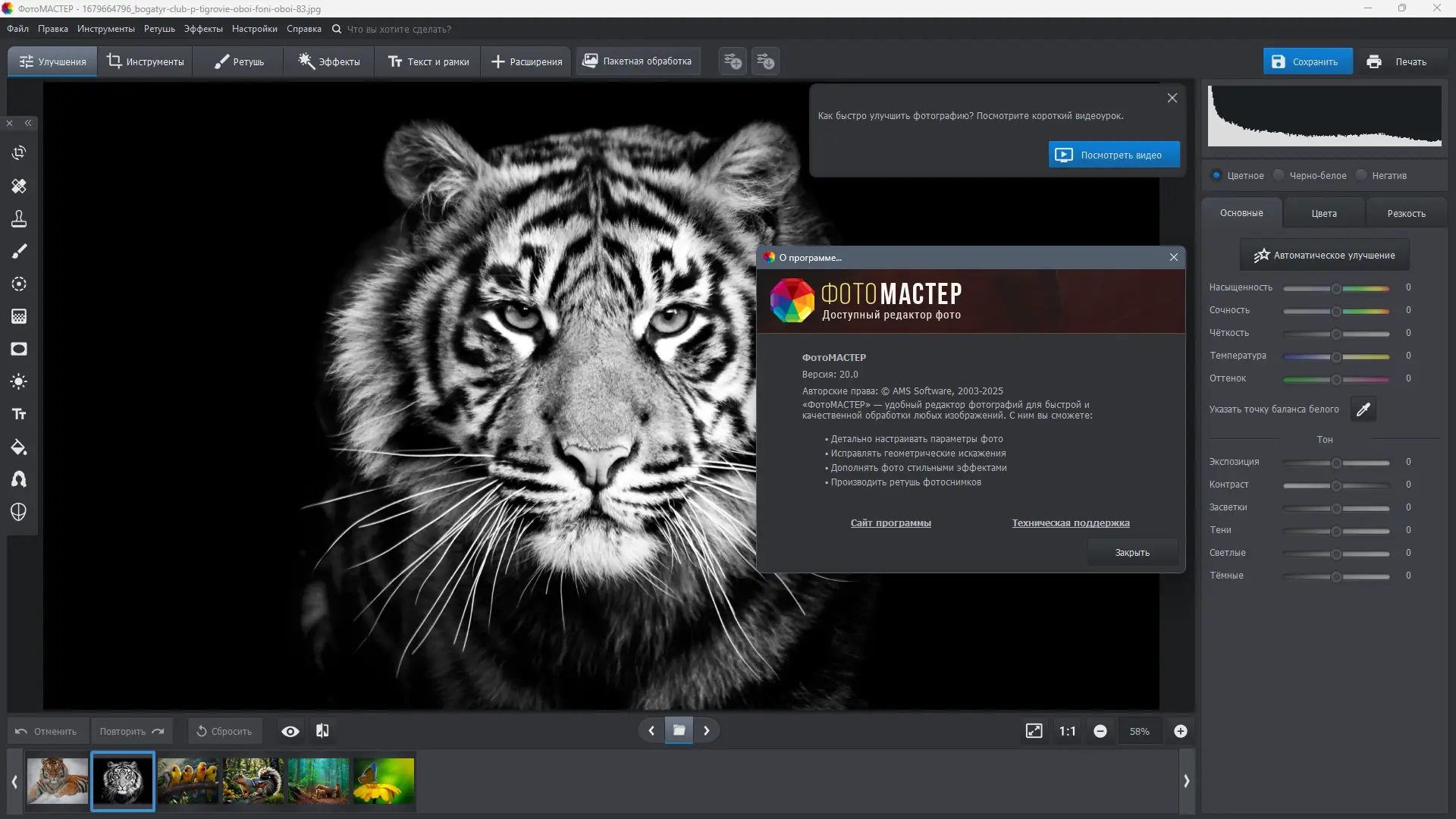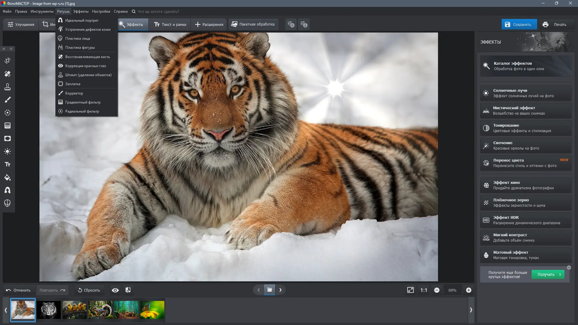 ФотоМАСТЕР — это универсальный инструмент для обработки и редактирования фотографий, который подойдет как новичкам, так и профессионалам. Благодаря современному дизайну и удобному интерфейсу, пользователи могут легко применять эффекты, корректировать цвет, резкость и контраст, а также выполнять сложные задачи ретуши и коррекции. Программа обеспечивает быструю работу с любым типом изображений и поддерживает работу с фотографиями различного качества и форматов. Ее уникальная технология позволяет возвращать любые изменения к исходному состоянию в любой последовательности без ухудшения качества изображения.