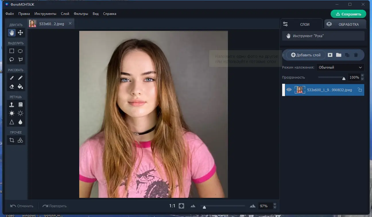 - Работа со слоями — добавлять спецэффекты, создавать коллажи, объединять изображения, использовать маски для редактирования отдельных участков.