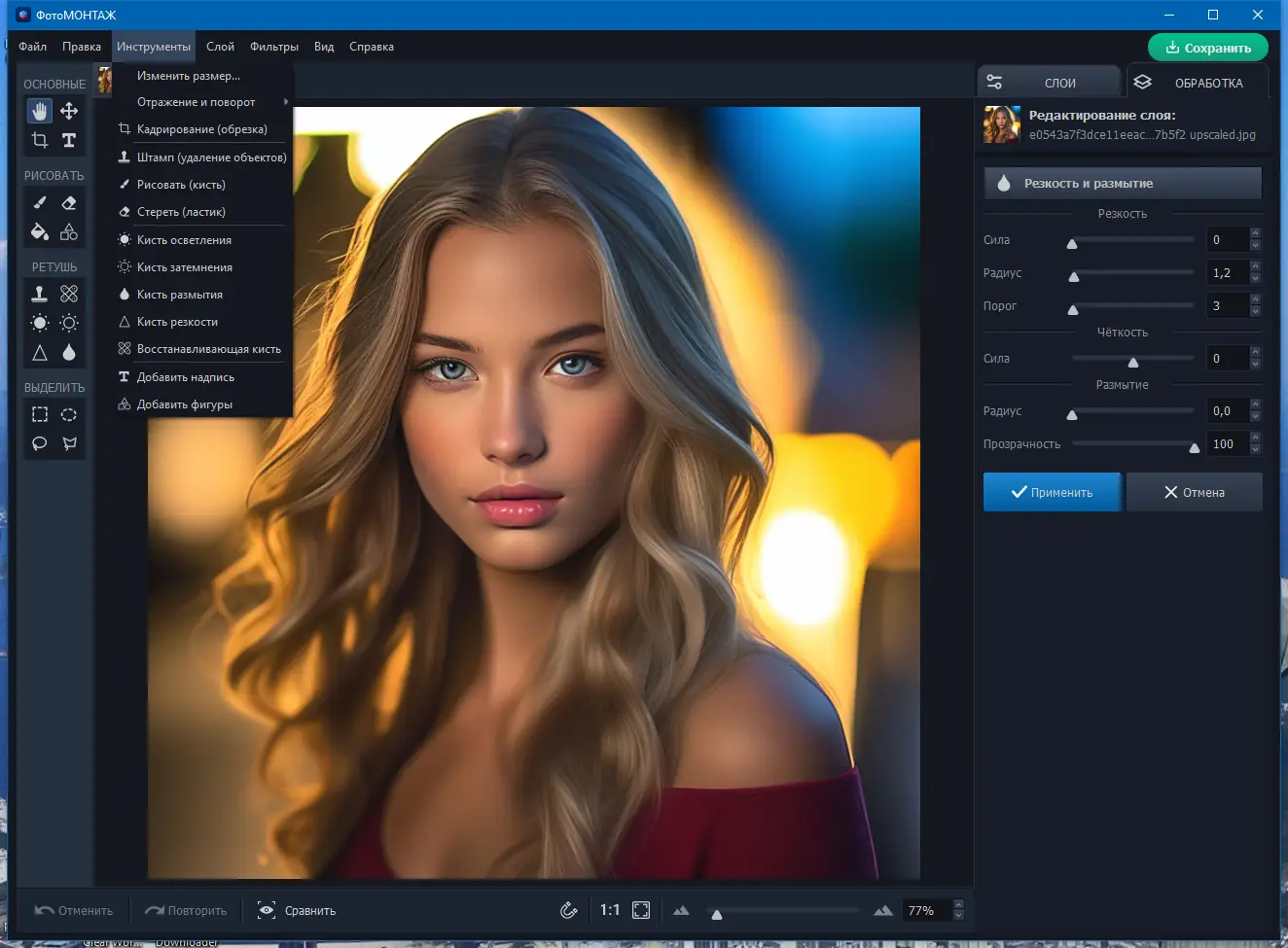 - Инструменты профессиональной ретуши лица и коррекции цвета.