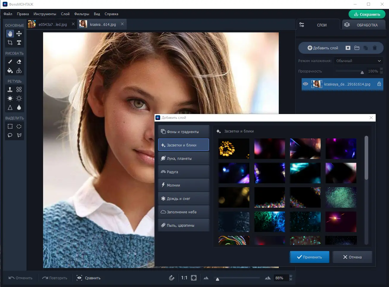 - Добавление спецэффектов, фильтров и выразительных элементов оформления, таких как блики, снег, дождь, молнии и туман.
