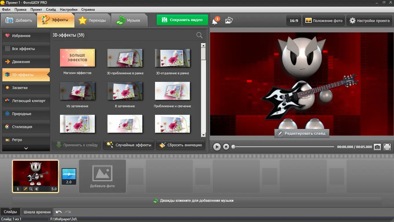 - Большой выбор эффектов и переходов, в том числе 3D и градиентных, что позволяет реализовать любые идеи.