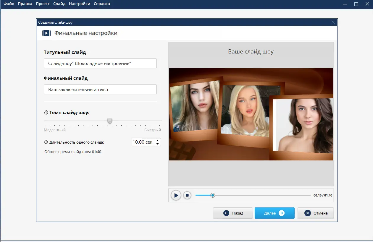 - Динамичное создание слайд-шоу с музыкой, передающее настроение и атмосферу любимых моментов.