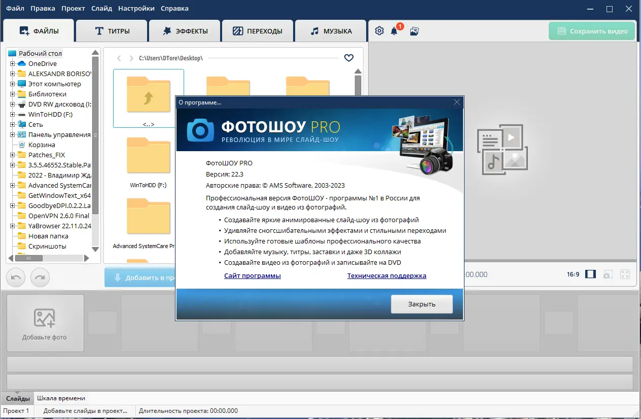 ФотоШОУ — это мощная программа для создания профессиональных слайд-шоу из фотографий и музыки, которая позволяет реализовать даже самые креативные идеи. Инновационный подход и богатый функционал делают её незаменимым инструментом для фотографов, видеографов и любителей.