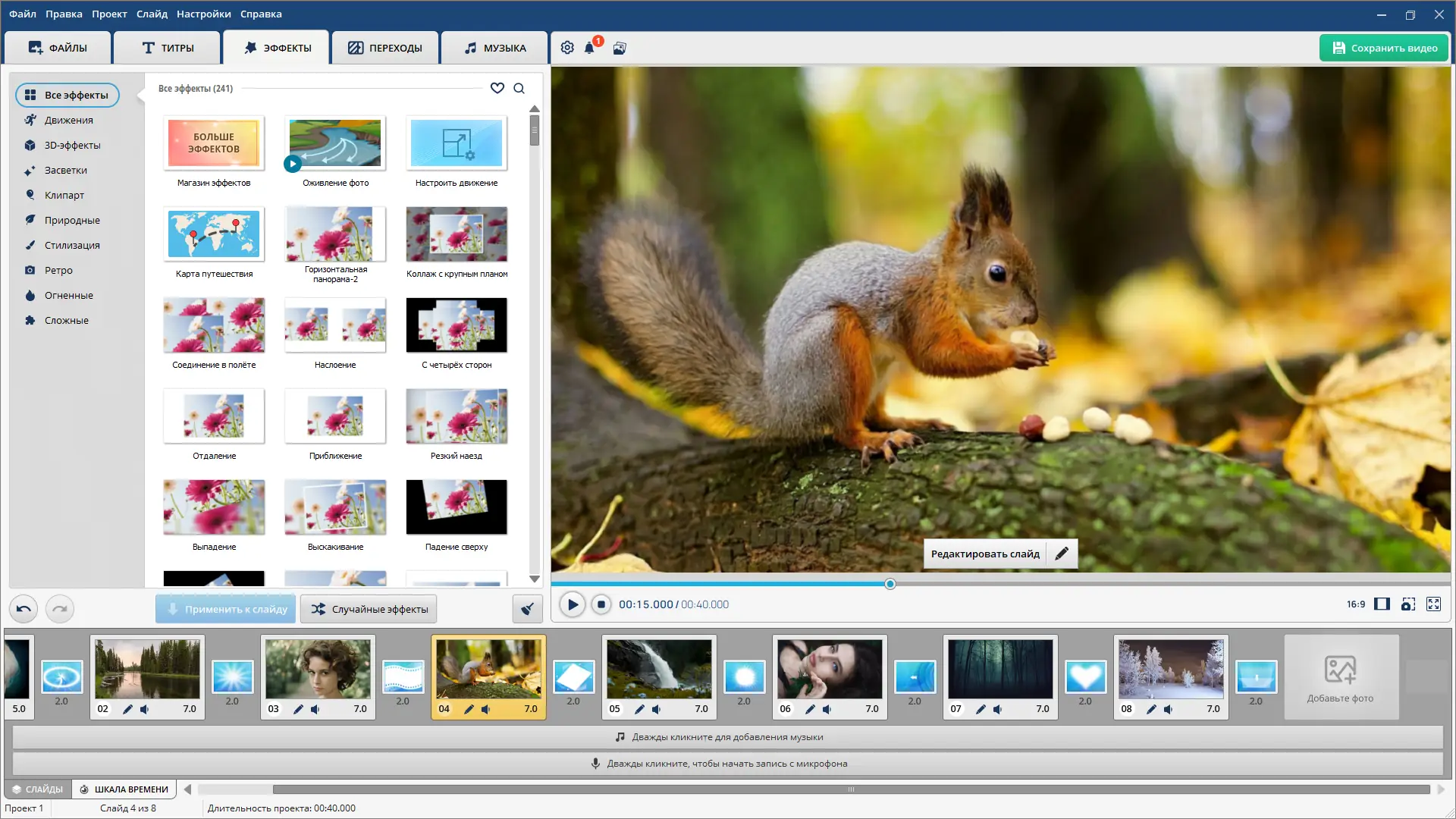 - Большой выбор эффектов и шаблонов, включая 3D-анимации и профессиональные коллажи.