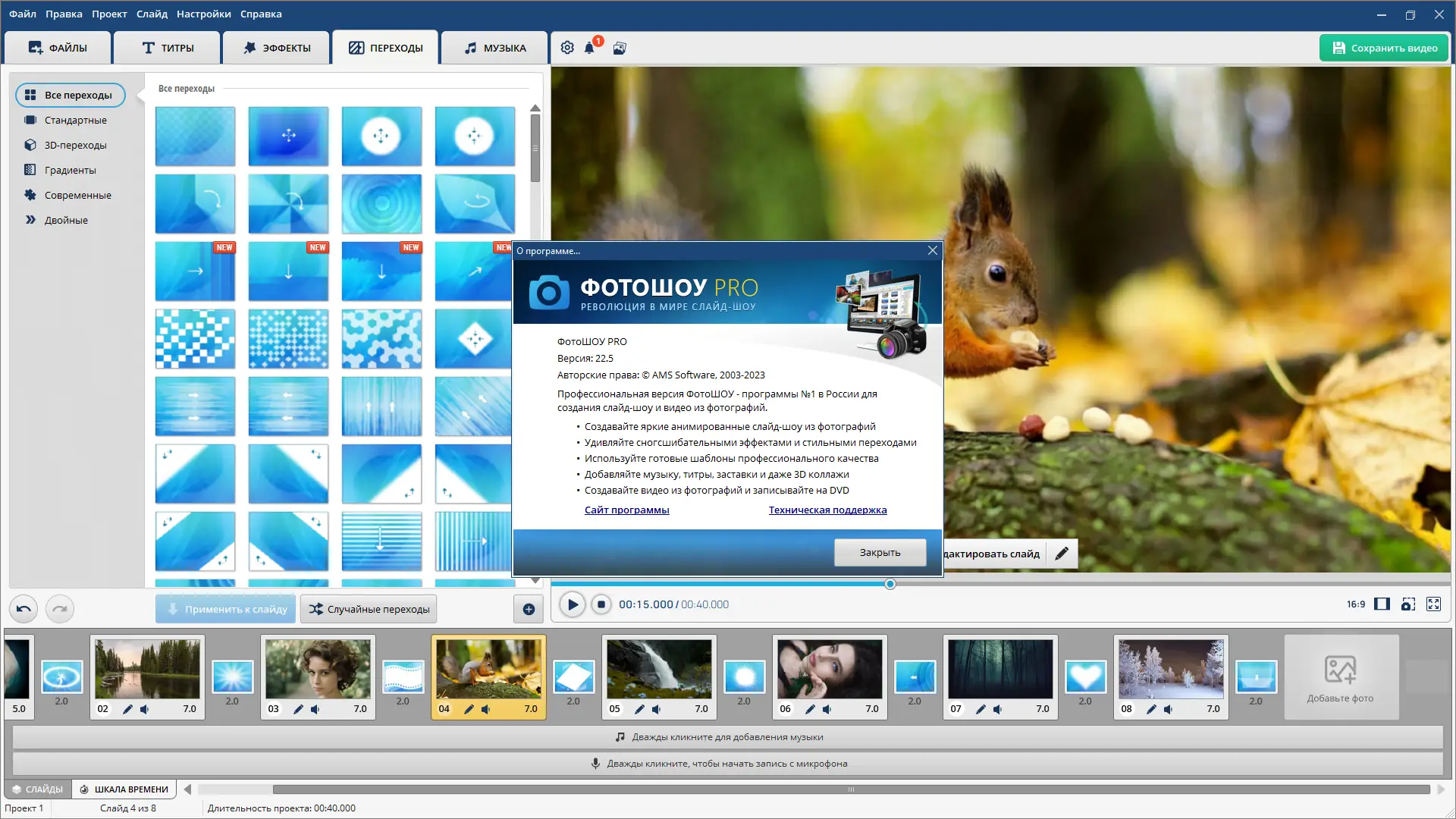 ФотоШОУ PRO открывает широкие возможности для создания впечатляющих фильмов из ваших фотографий. Ваша коллекция снимков может превратиться в яркое, динамичное слайд-шоу с разнообразными эффектами и музыкой. Программа подходит для презентаций, свадебных фильмов, рассказов о путешествиях, праздничных мероприятий и Love Story. Благодаря сотням эффектов анимации, элегантным переходам и встроенным шаблонам, вы сможете легко создавать уникальные проекты без профессиональных навыков. Встроенная система поддержки эффектов 3D и многослойных анимаций позволит оживить каждую фотографию, создавая зрелищные видео. Возможность экспорта на видео в различных форматах, а также загрузки непосредственно на YouTube делает создание мультимедиа кратчайшим путём к результату. Интерфейс полностью на русском языке, а подробный учебник и видеокурсы помогают освоить все функции программы за короткое время.