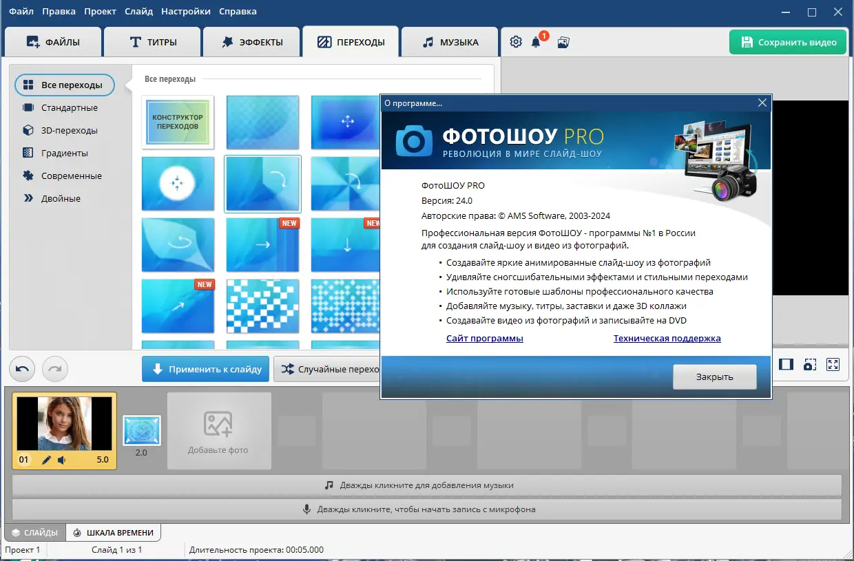 ФотоШОУ PRO — мощная программа для создания профессиональных слайд-шоу из фотографий и музыки. Позволяет реализовать уникальные видеоэффекты и эффектные переходы, делая ваши проекты яркими и запоминающимися.