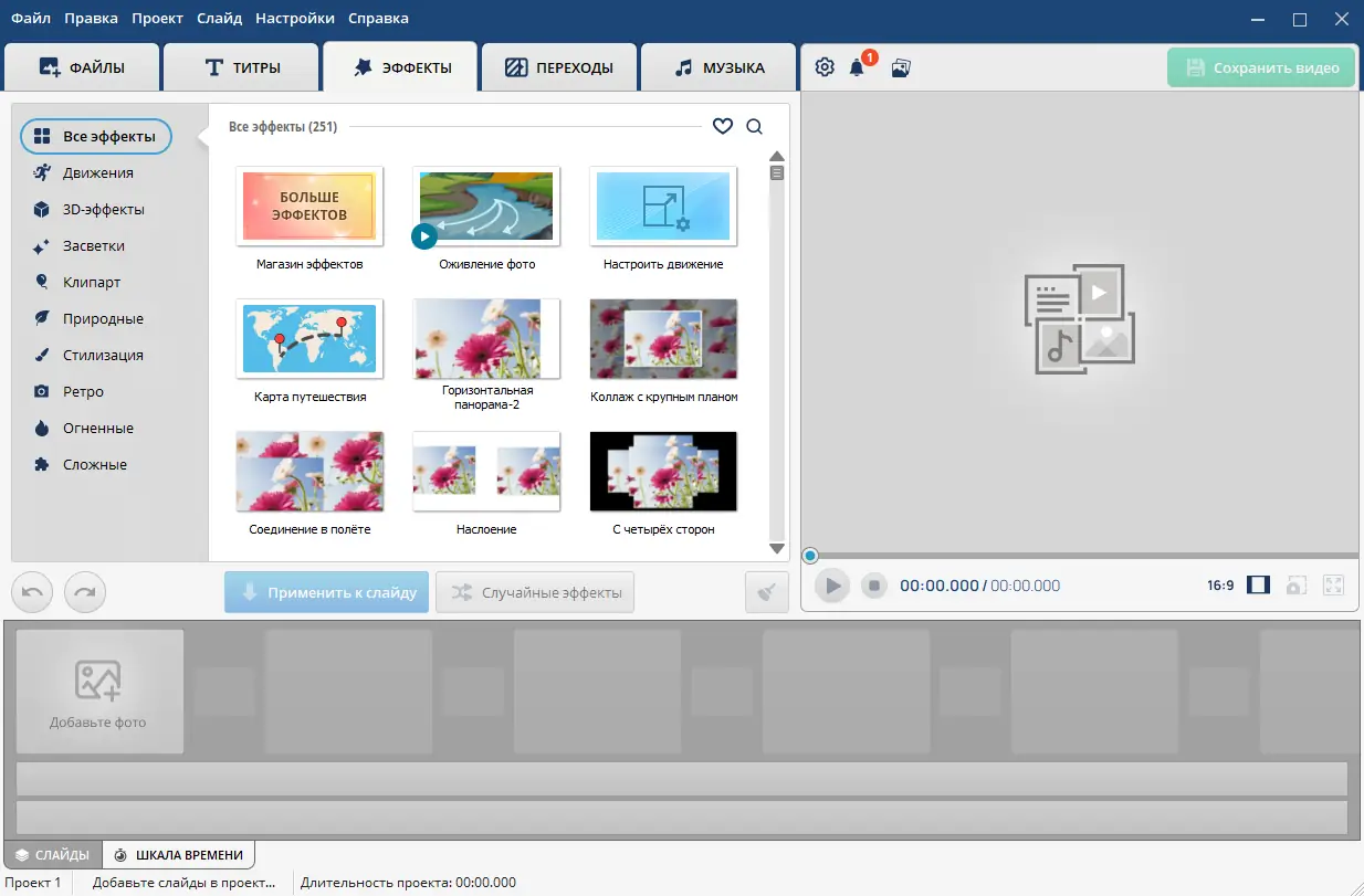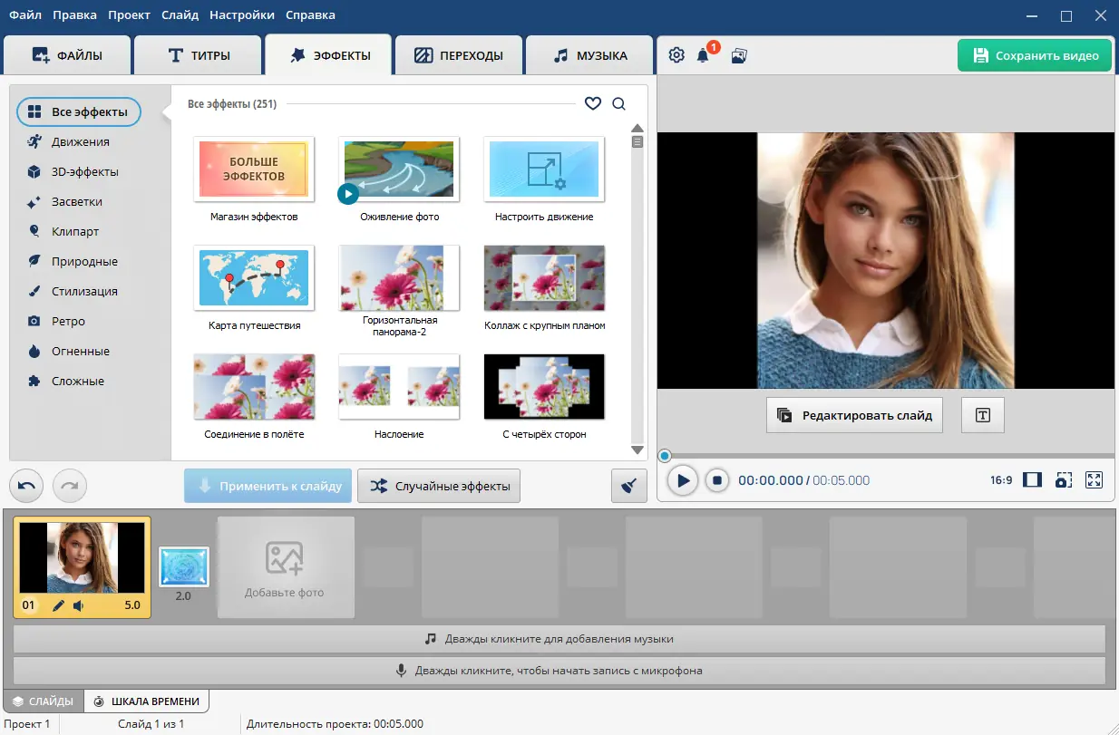 - Стильные эффекты переходов — свыше 100 оригинальных вариантов, включая 3D-переходы, градиенты и классические эффекты.