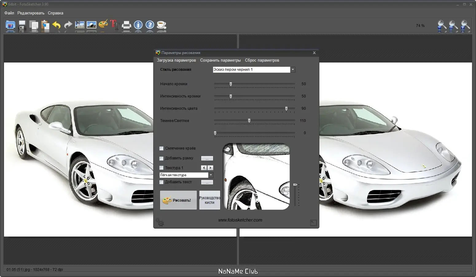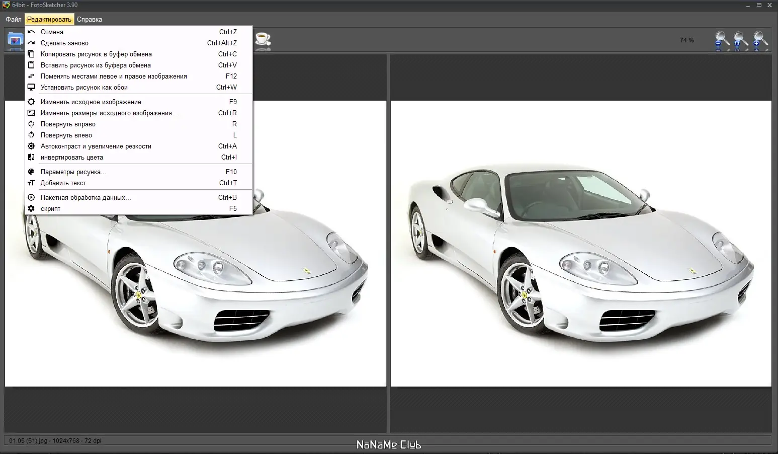 FotoSketcher — простая в использовании программа, разработанная для работы с изображениями и фотографиями. Благодаря удобному интерфейсу, разделённому на две части, вы легко можете наблюдать исходное изображение и результат обработки. В программе доступно более 20 различных опций для редактирования — это настройка яркости, контрастности, насыщенности и другие, что делает её универсальной для выполнения широкого спектра задач. Также есть возможность использовать портативную версию, которая не требует установки и идеально подходит для работы на разных компьютерах.