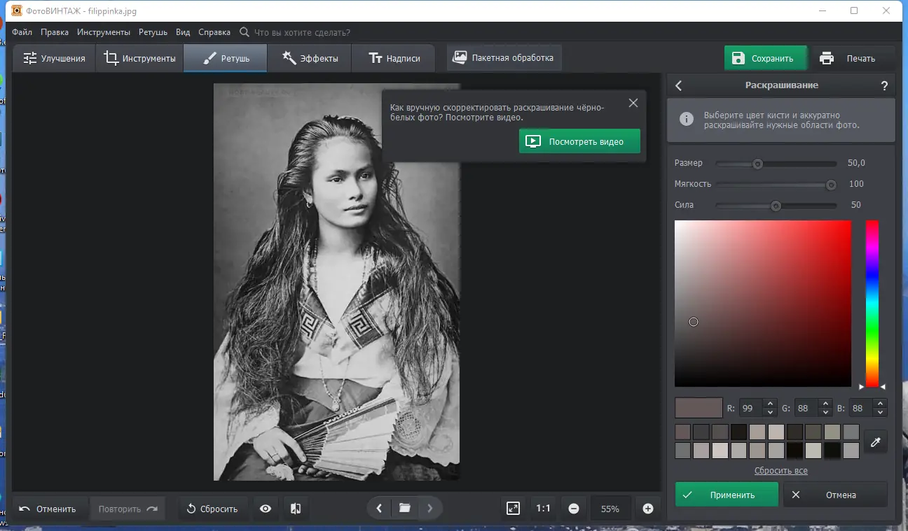- Автоматическое умное раскрашивание черно-белых фотографий с возможностью ручной коррекции.
