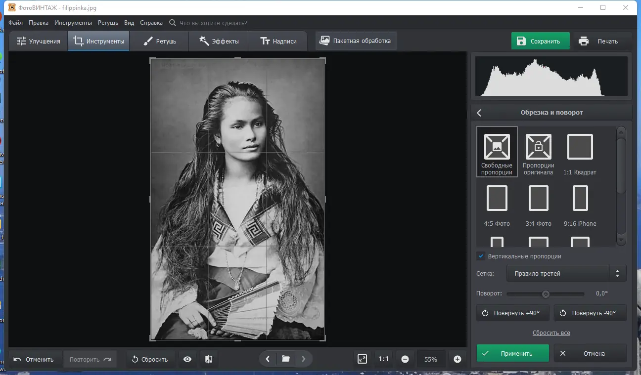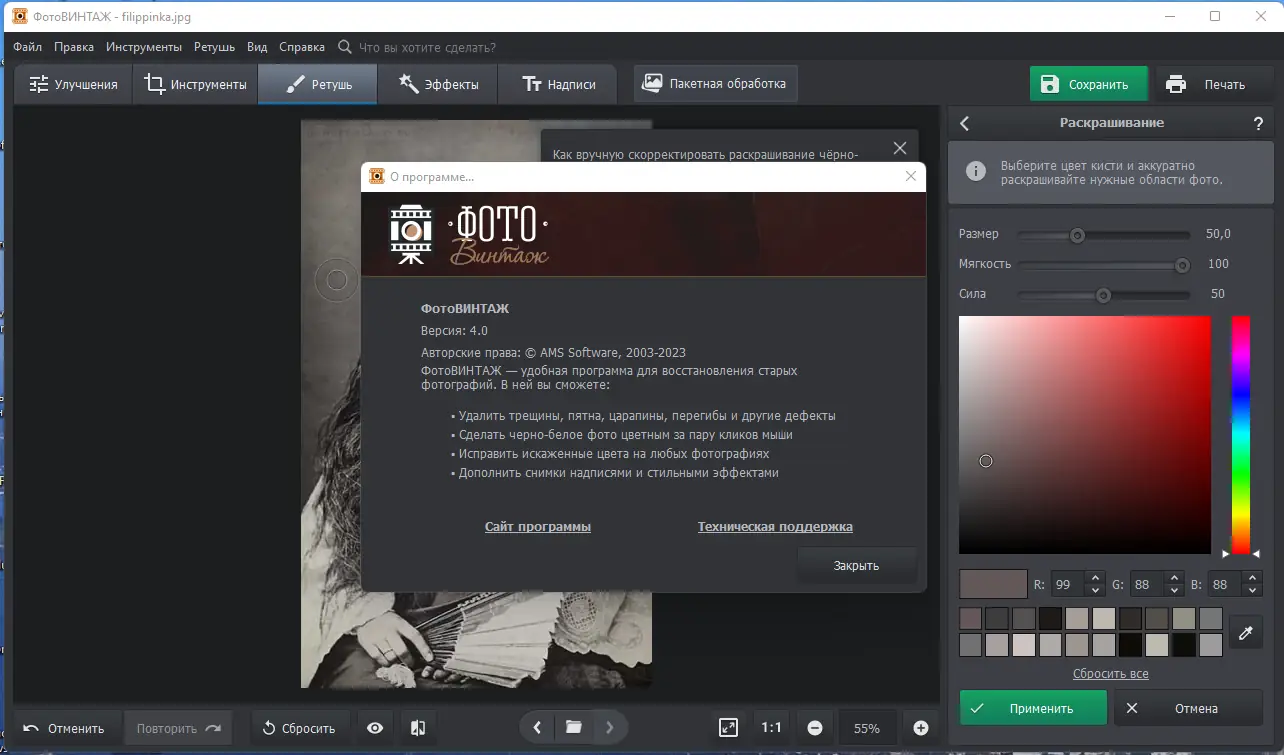 ФотоВИНТАЖ — современный редактор для восстановления и улучшения старых фотографий, позволяющий аккуратно избавиться от дефектов, сделать снимки более четкими и выполнить цветокоррекцию. Эта программа поможет вам вернуть жизни вашим старым фотоснимкам, перекрасить черно-белые фотографии в цвет и добавить интересные эффекты или надписи.