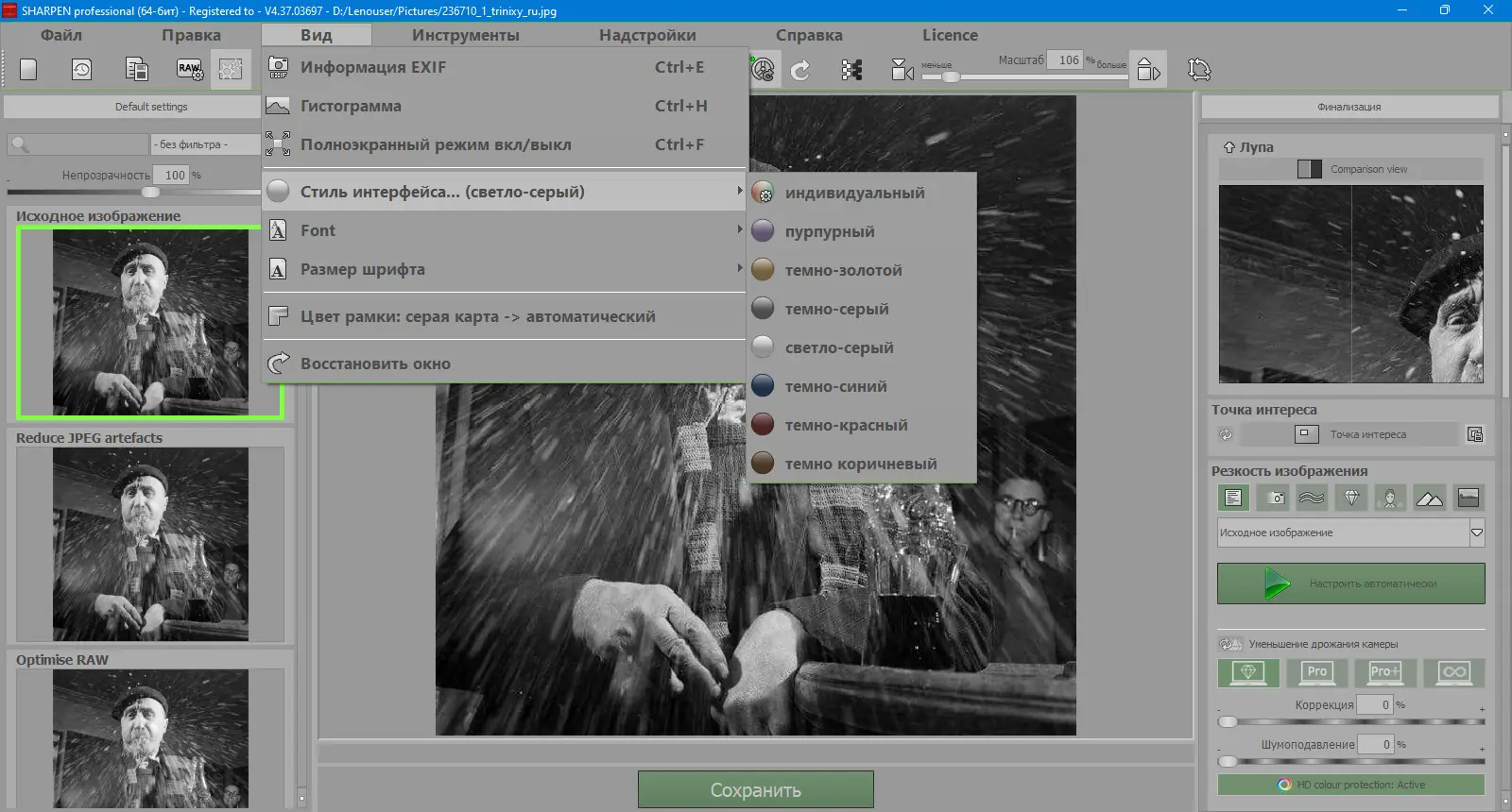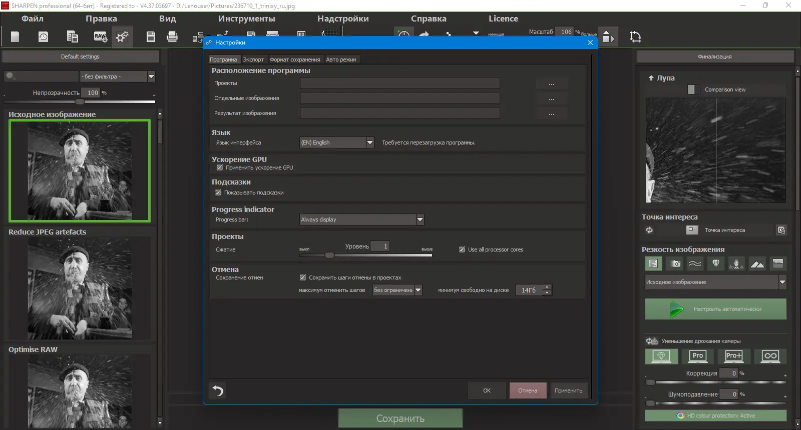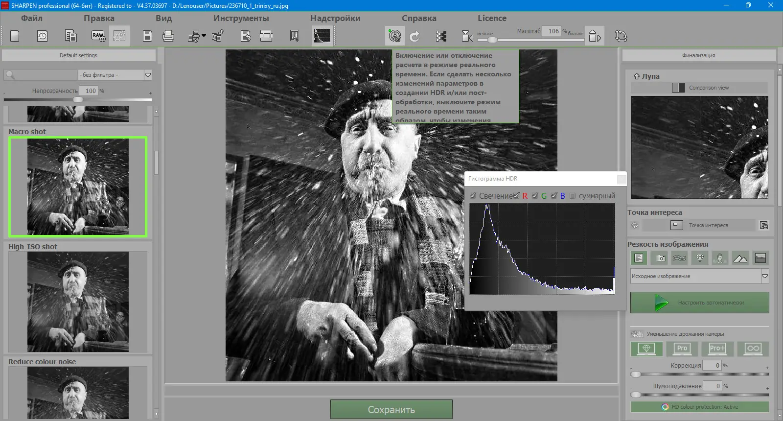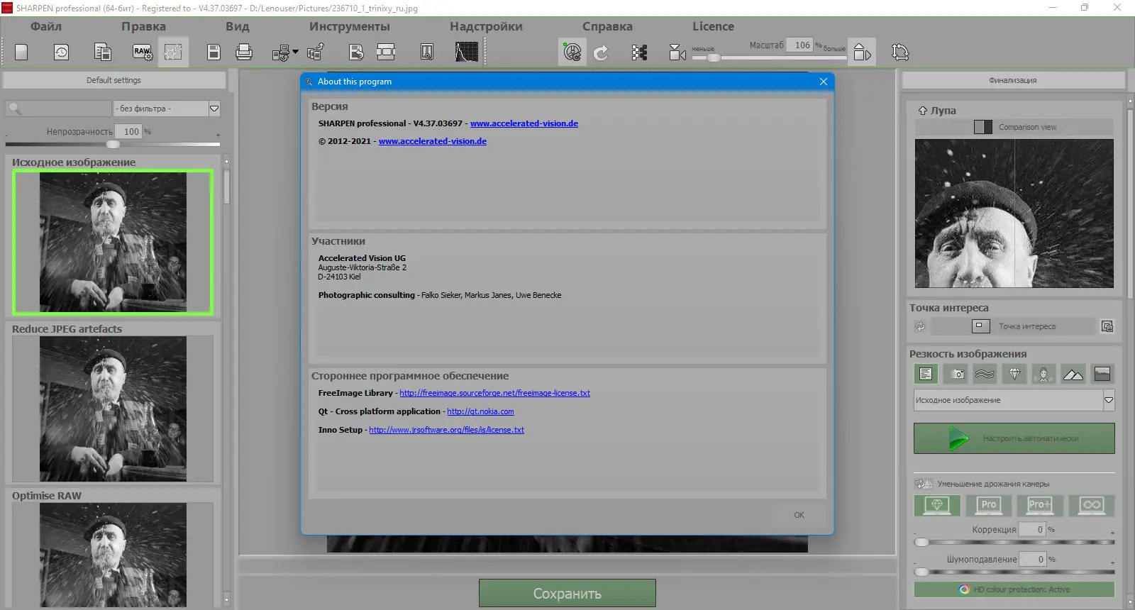 Особое внимание уделено инновационным алгоритмам, таким как Adaptive Multiscale Deconvolution, обеспечивающим коррекцию размытия в более чем 100 раз расширенной области, и Adaptive Gradient Sharpening, который подходит для обработки пейзажей, портретов, макроснимков и изображений продуктов. Программа включает функции исправления царапин, дымки и других ошибок, делая обработку максимально автоматизированной и эффективной.