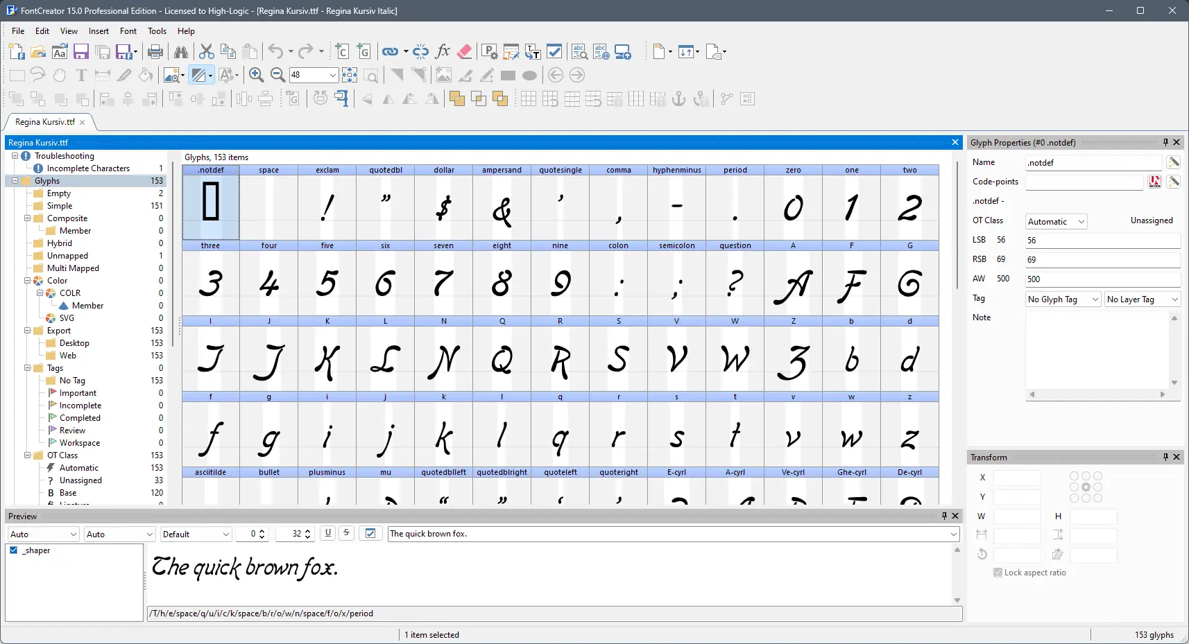 Создавайте свои собственные шрифты с нуля или импортируйте их из бумажных носителей с помощью сканера. Редактор поддерживает работу с как рукописными, так и печатными шрифтами, в том числе с русскими, английскими буквами, цифрами и специальными знаками. Функции проверки и автоматической трансформации облегчают проектирование и повышают качество конечного результата. Благодаря широкой поддержке форматов и кодировок, вы можете импортировать векторные и растровые изображения, а также создавать и корректировать сотни глифов и кернинговых пар, делая шрифты уникальными и профессиональными.