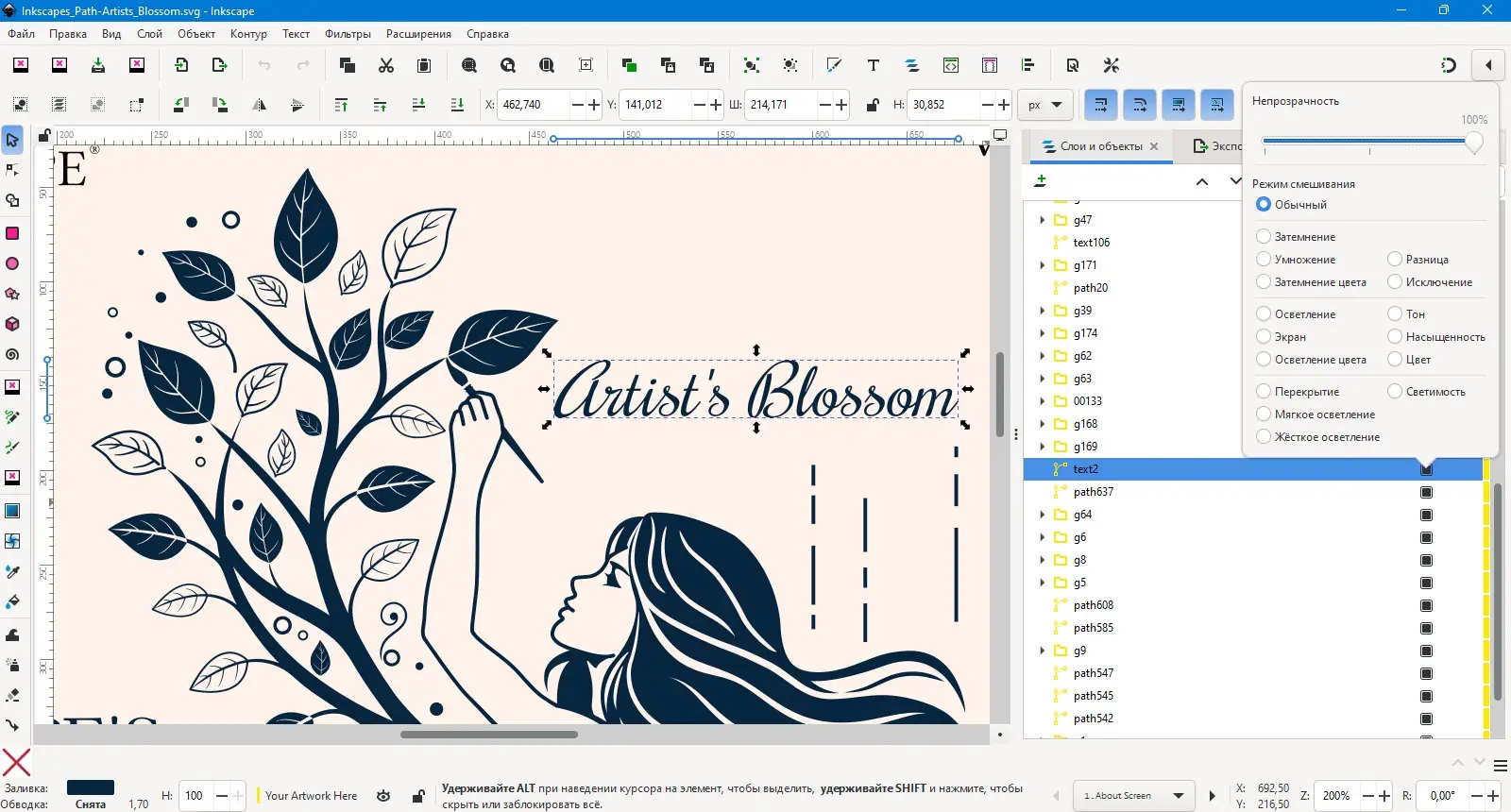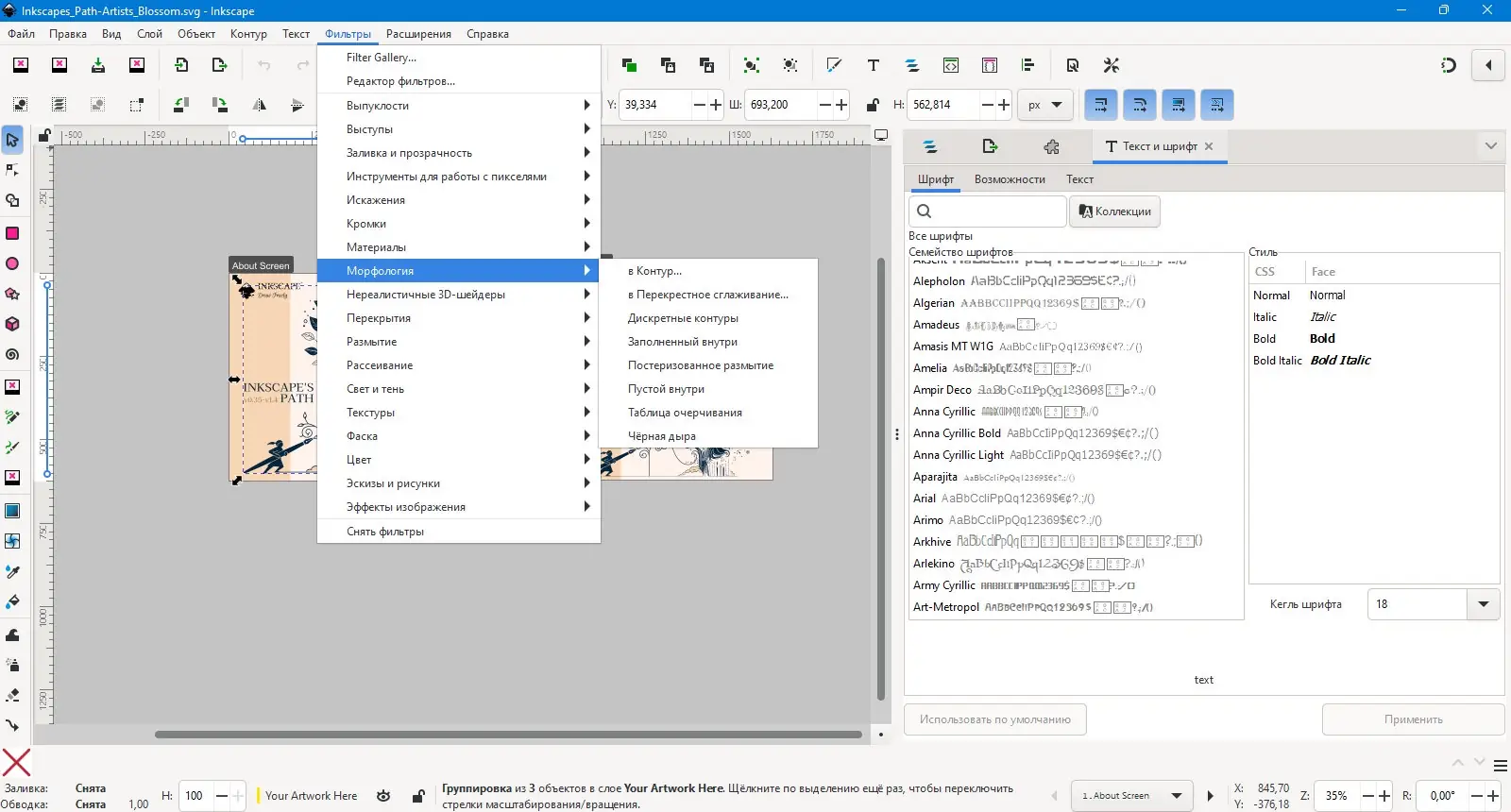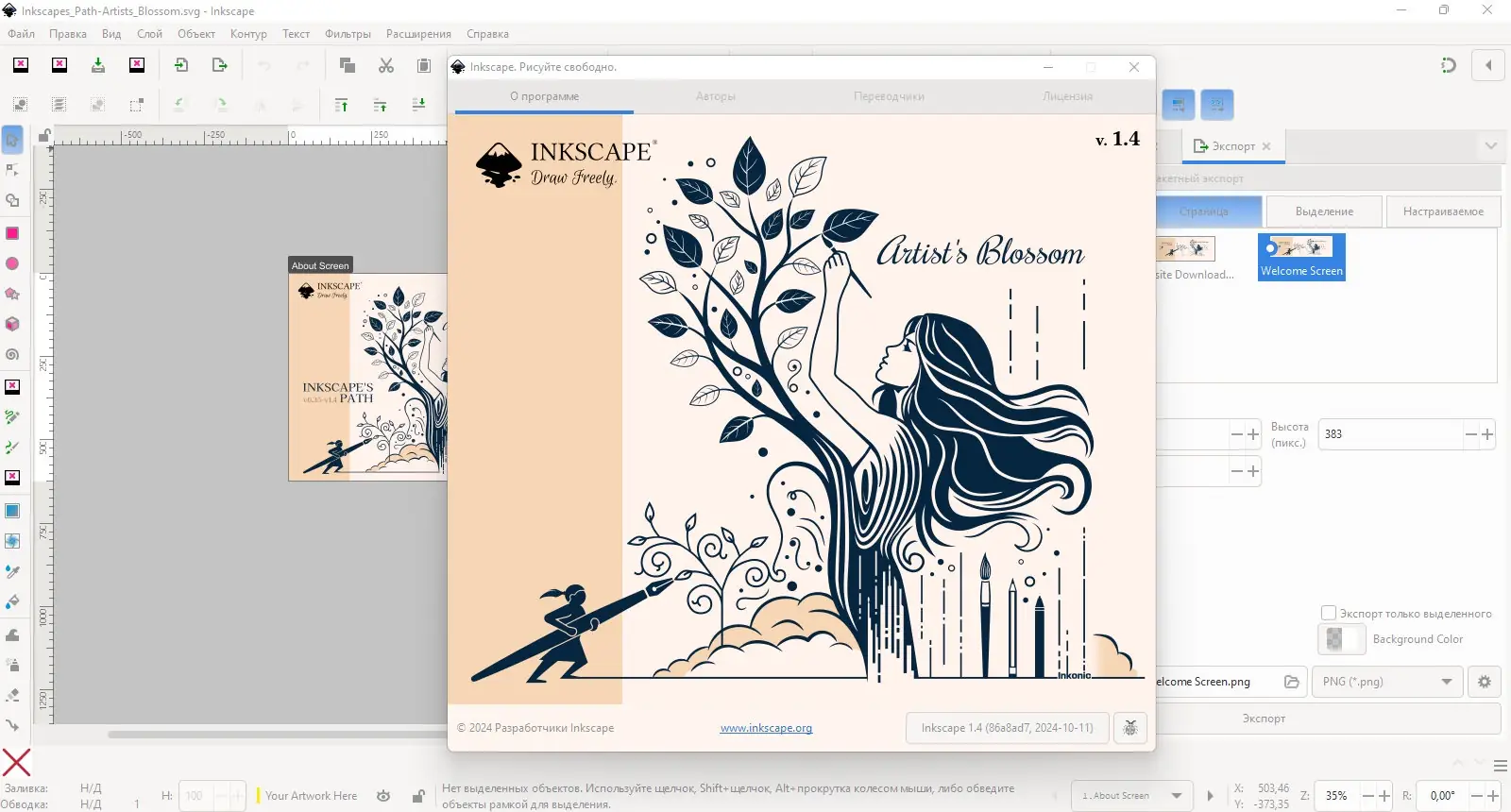 Inkscape – это мощный редактор векторной графики с открытым исходным кодом. Он обладает широкими возможностями для создания и редактирования сложных векторных изображений, поддерживая полностью совместимые форматы CSS, XML и SVG. Программа отличается удобным расположением инструментов, полностью русифицированным интерфейсом с момента установки, что делает работу максимально комфортной для пользователей на русском языке. В Inkscape реализованы расширенные функции для управления цветом, стилями, градиентами и маркерами контура. Этот редактор поддерживает все основные возможности SVG, включая работу с альфа-каналом, текстурами, трансформациями, клоннированием и векторизацией растровых изображений, что позволяет создавать профессиональные композиции и технические иллюстрации.