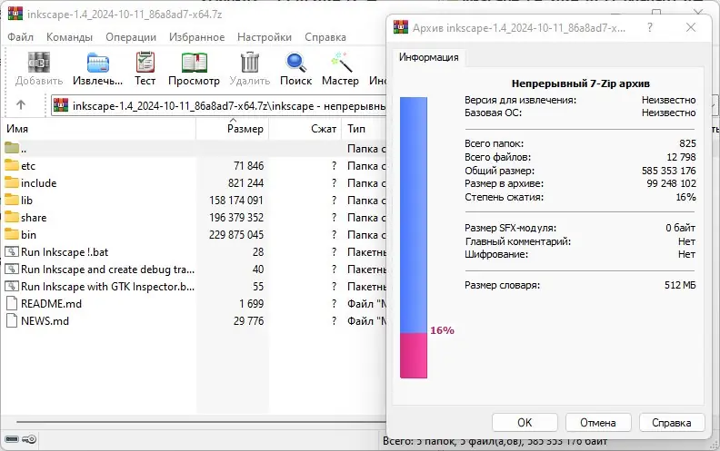 - Распакуйте архив с выбранным дистрибутивом, например, файлом inkscape-1.4_2024-10-11_86a8ad7-x64.7z.