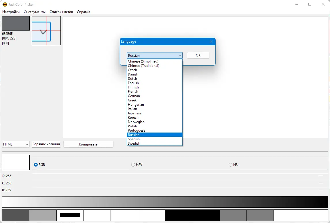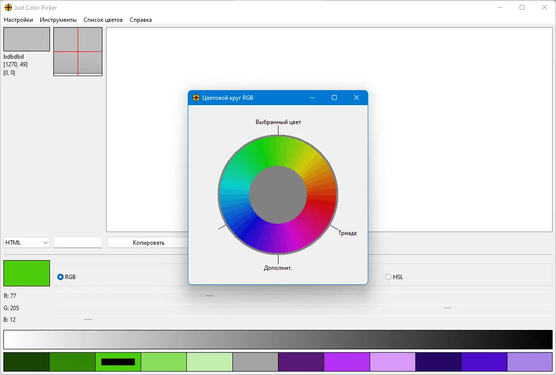 Just Color Picker — бесплатная портативная программа для точного определения цвета на экране. Она предназначена для дизайнеров, разработчиков и профессионалов, работающих с цветовой гаммой, обеспечивая быстрый доступ к желаемому оттенку и его кодам.