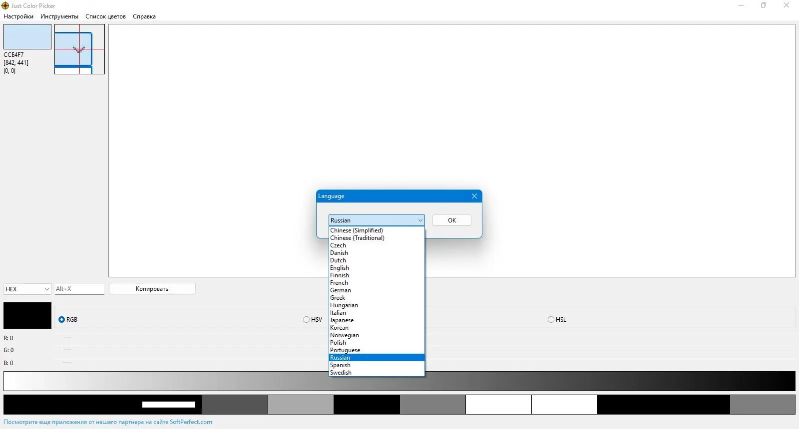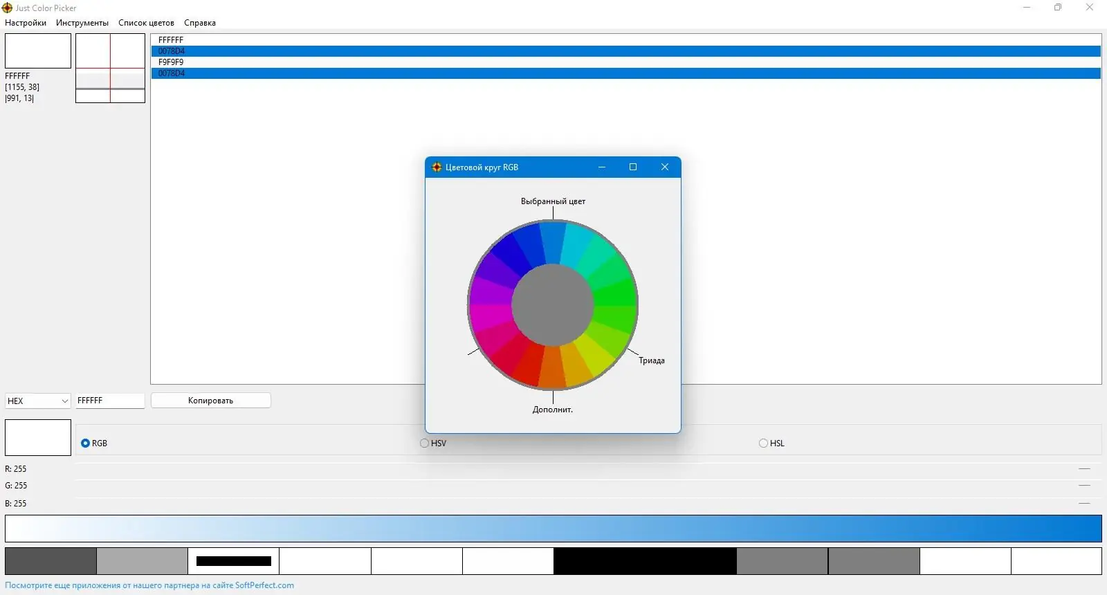 Just Color Picker — это портативное приложение, которое позволяет легко определить цвет любого пикселя на экране с высокой точностью. Благодаря поддержке нескольких цветовых форматов, таких как HTML, RGB, HEX, HSB / HSV и HSL, программа обеспечивает полную гибкость в работе с цветами. Удобные функции копирования кодов цвета в буфер обмена с горячими клавишами значительно ускоряют рабочий процесс. Начиная с версии 5.8, доступен только 64-разрядный вариант для современных систем Windows 7, 8/8.1, 10 и 11. Программа не требует инсталляции и может запускаться прямо с переносных носителей, что делает её особенно удобной для работы в разных условиях.