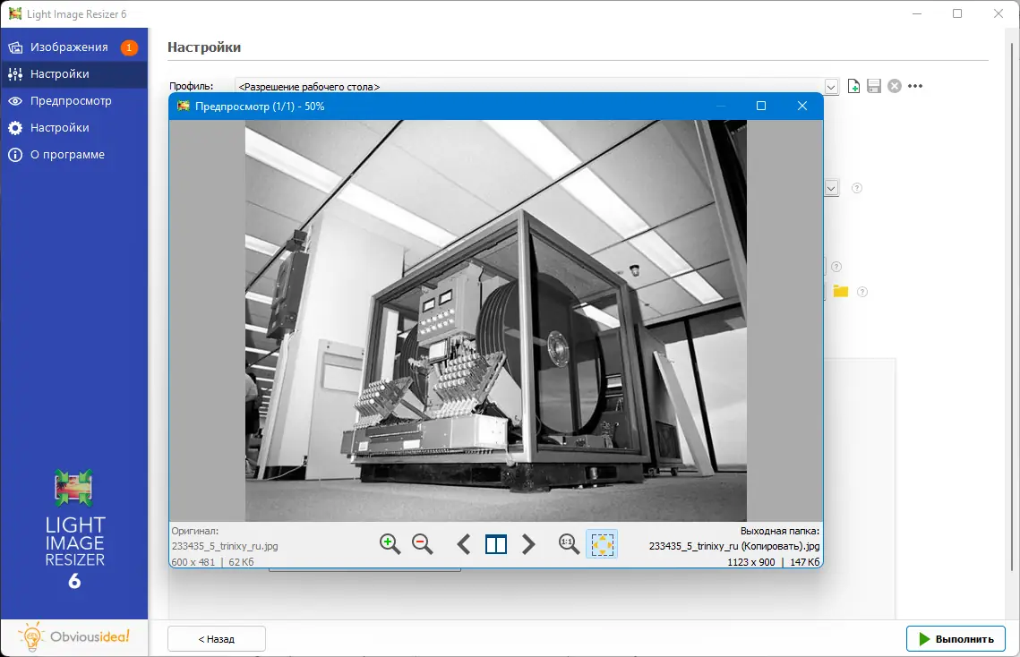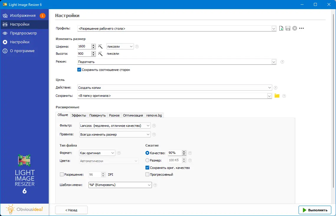 - Изменение размеров и разрешения файлов с возможностью выбора коэффициента сжатия