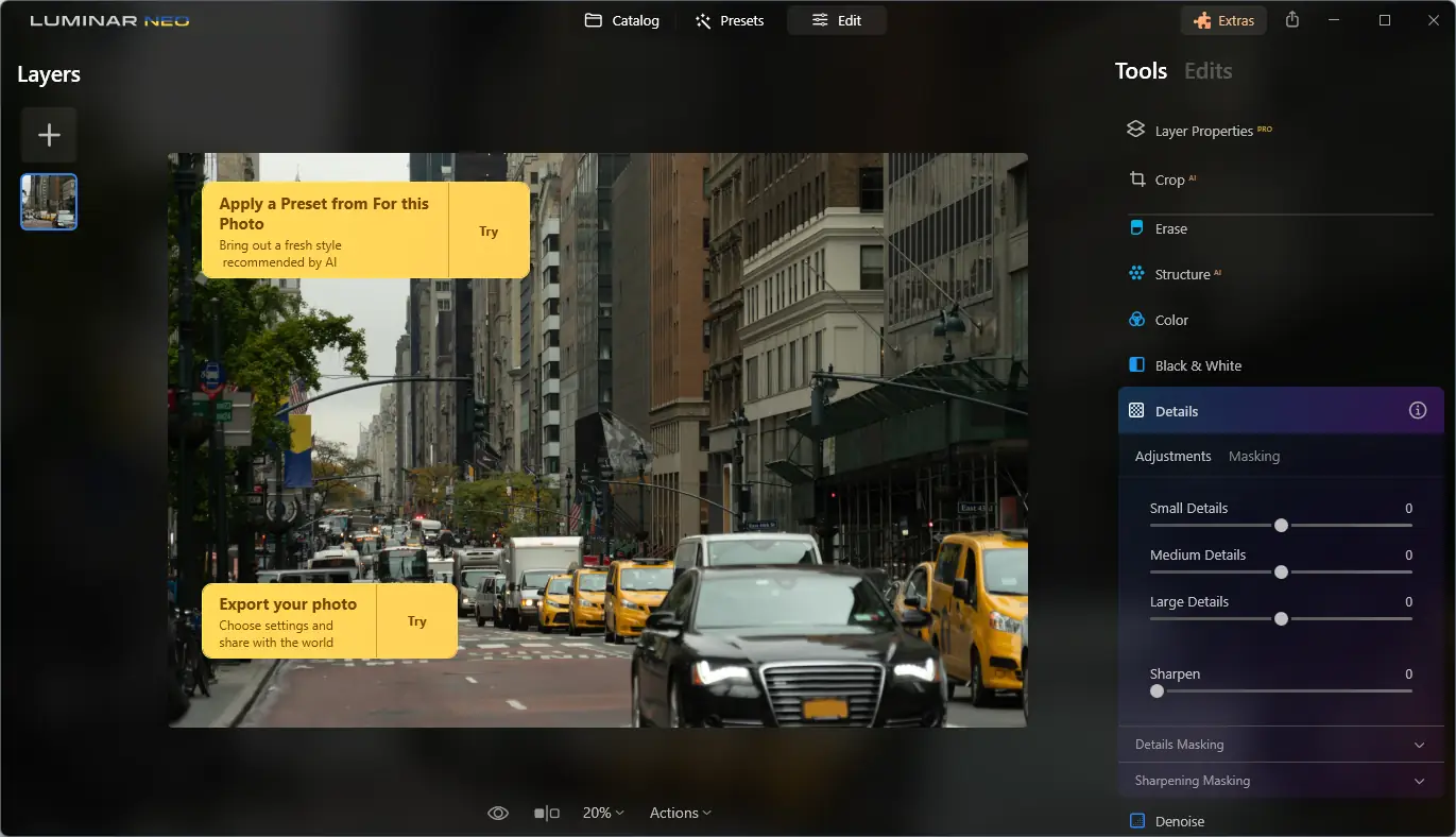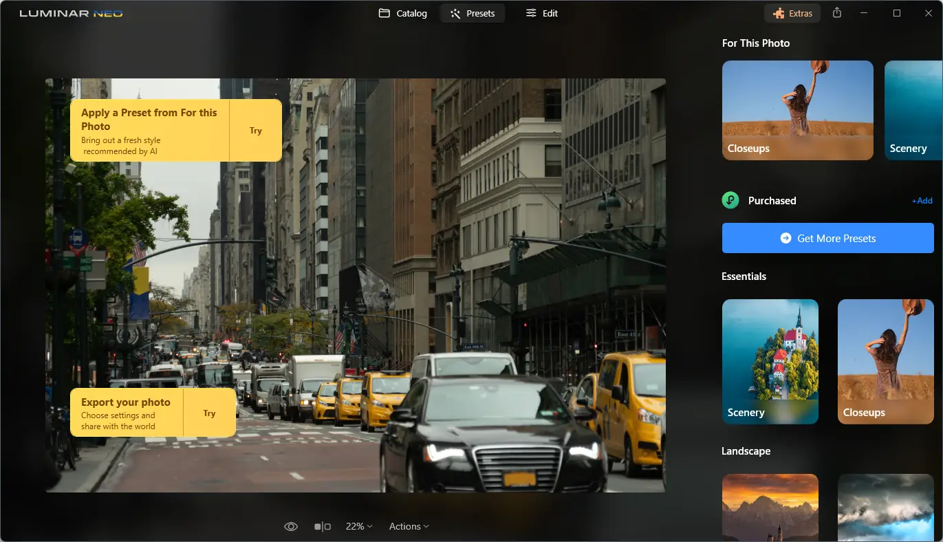 Luminar — это современный фоторедактор с поддержкой искусственного интеллекта, предназначенный для профессиональной и любительской обработки изображений на платформах Windows и Mac. Программа объединяет мощные инструменты редактирования с интуитивным интерфейсом и автоматическими функциями для достижения высокого качества фотографий без необходимости профессиональных навыков обработки.