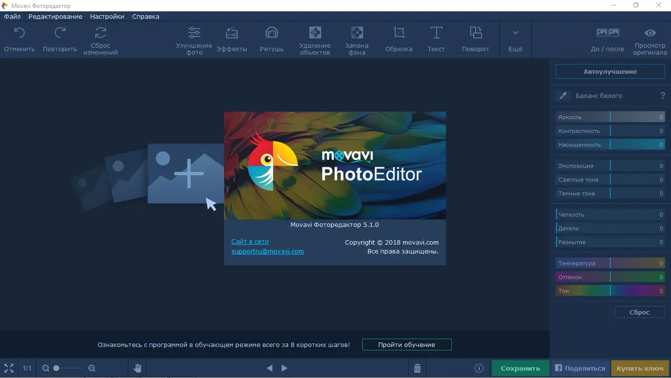 Movavi Photo Editor позволяет удалять лишние объекты с фотографий, автоматизировать улучшение изображений с помощью встроенных алгоритмов, а также легко корректировать яркость, контрастность и цвета. Благодаря поддержке всех популярных графических форматов и наличию гистограммы, работа с изображениями становится максимально удобной и точной. Программа подходит как для быстрого улучшения фотографий, так и для более профессиональной обработки, предоставляя опытным пользователям инструменты для детальной настройки. Понятный интерфейс на русском языке делает использование максимально комфортным, а возможность бесплатной легальной активации делает её привлекательной для широкого круга пользователей.