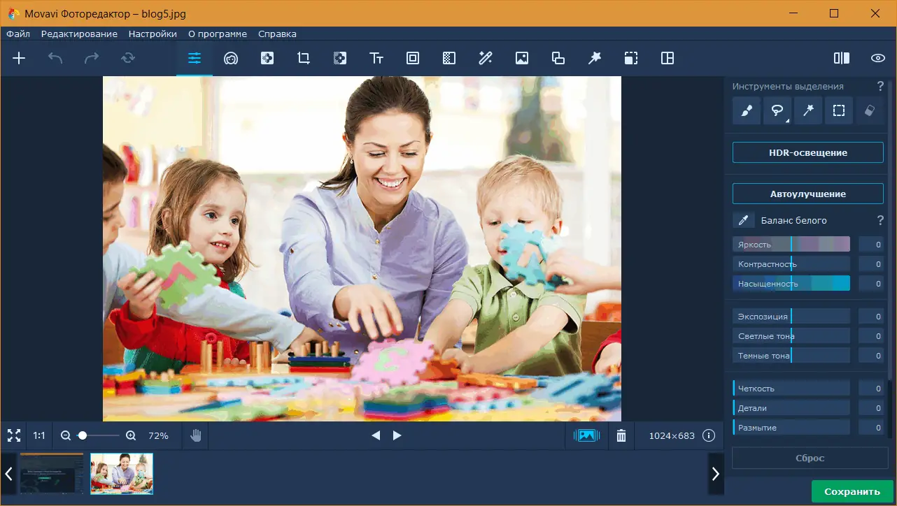 - Коррекция яркости, насыщенности, контрастности и баланса белого
