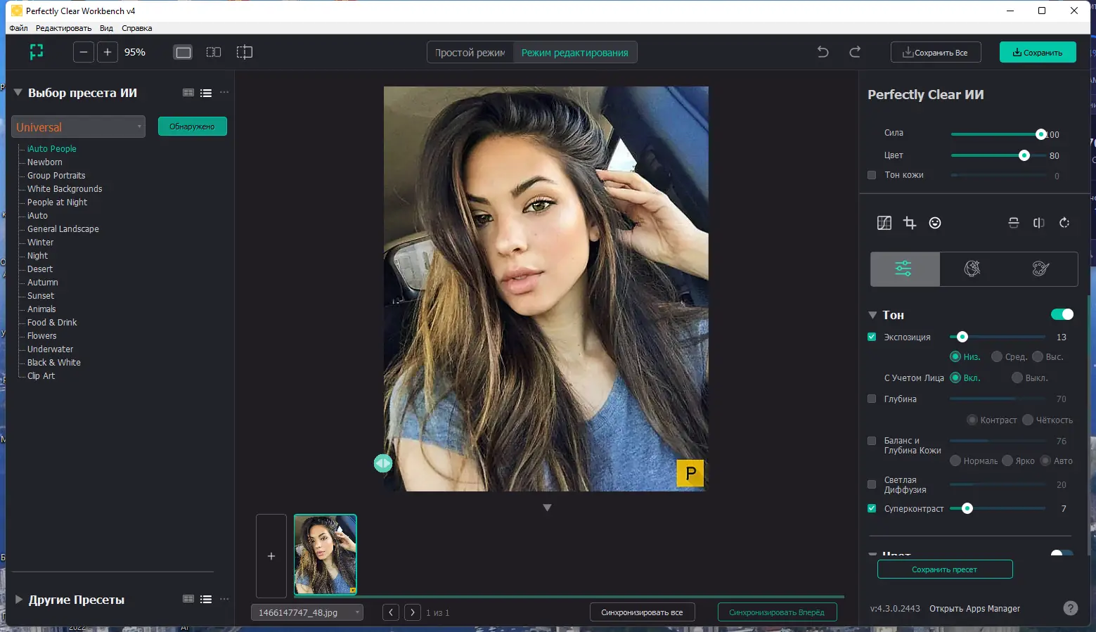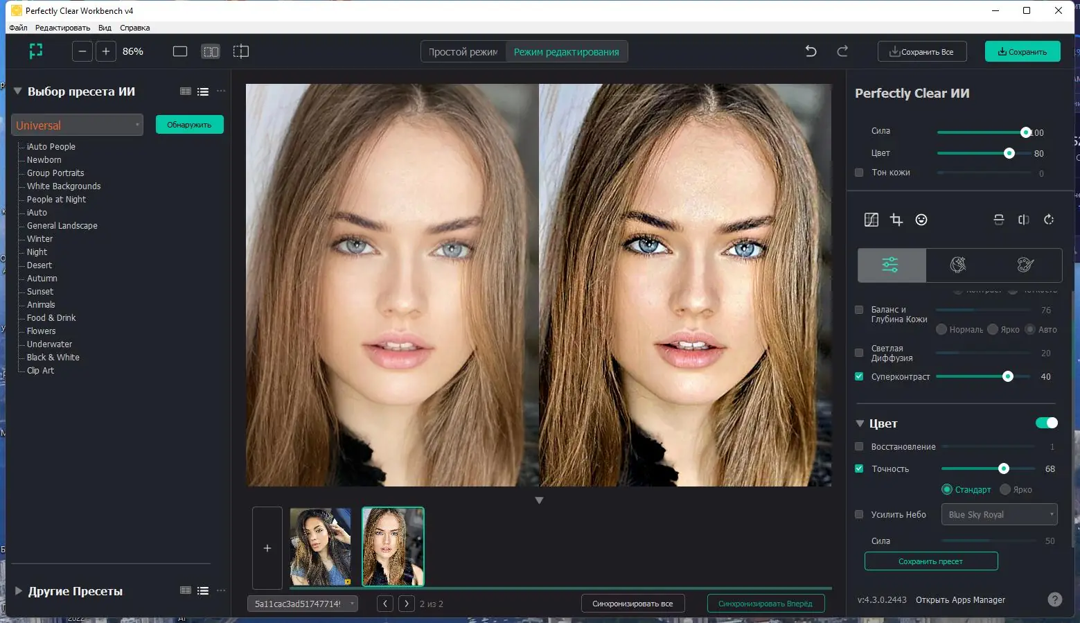 Perfectly Clear WorkBench — это мощный инструмент для автоматической и ручной коррекции фотографий, позволяющий быстро достигать профессиональных результатов. Используйте его для устранения дефектов изображений, таких как засветка, шумы и цветовые искажения, и сохраняйте ценные воспоминания в лучшем виде.