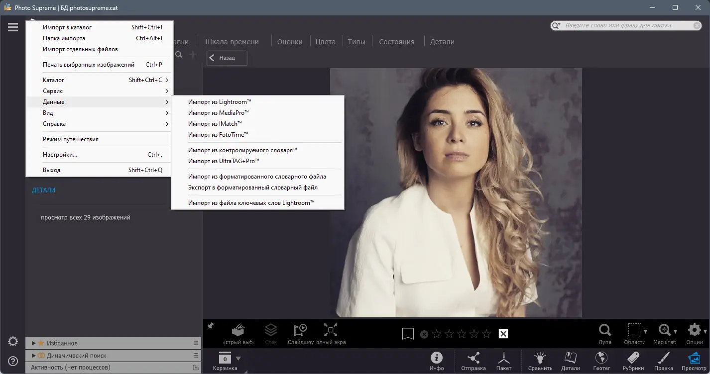 Photo Supreme представляет собой универсальный инструмент для работы с цифровыми фотографиями. Он поддерживает импорт изображений с различных устройств, позволяет создавать и управлять каталогами, искать дубликаты и распознавать лица. Благодаря богатому набору функций, программа обеспечивает организацию фотографий и их подготовку к публикации или архивированию. Можно просматривать и редактировать изображения, создавать слайд-шоу и отправлять фотографии по электронной почте, а также публиковать их в интернете в различных форматах.