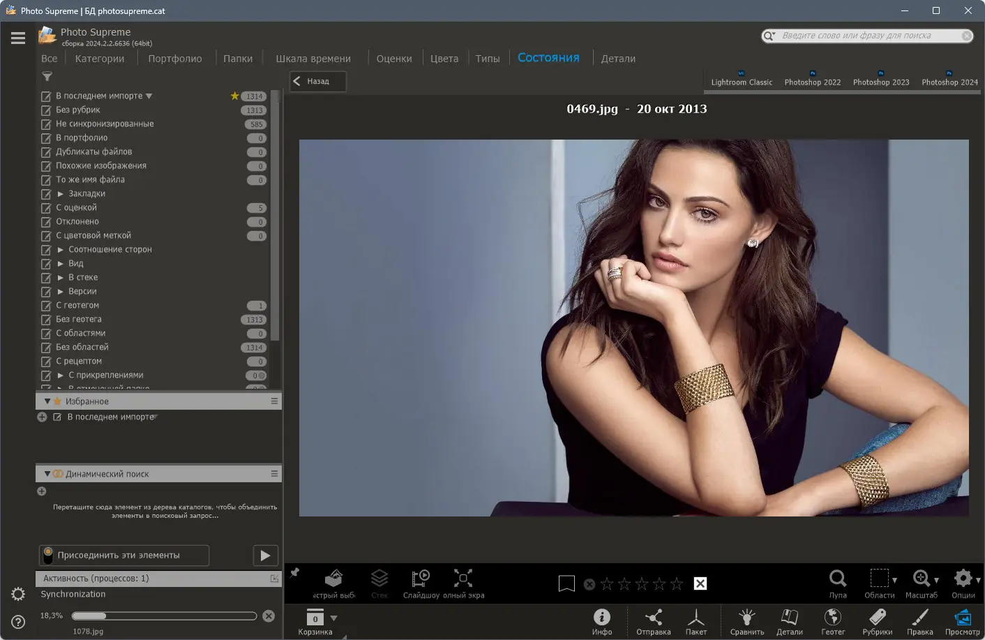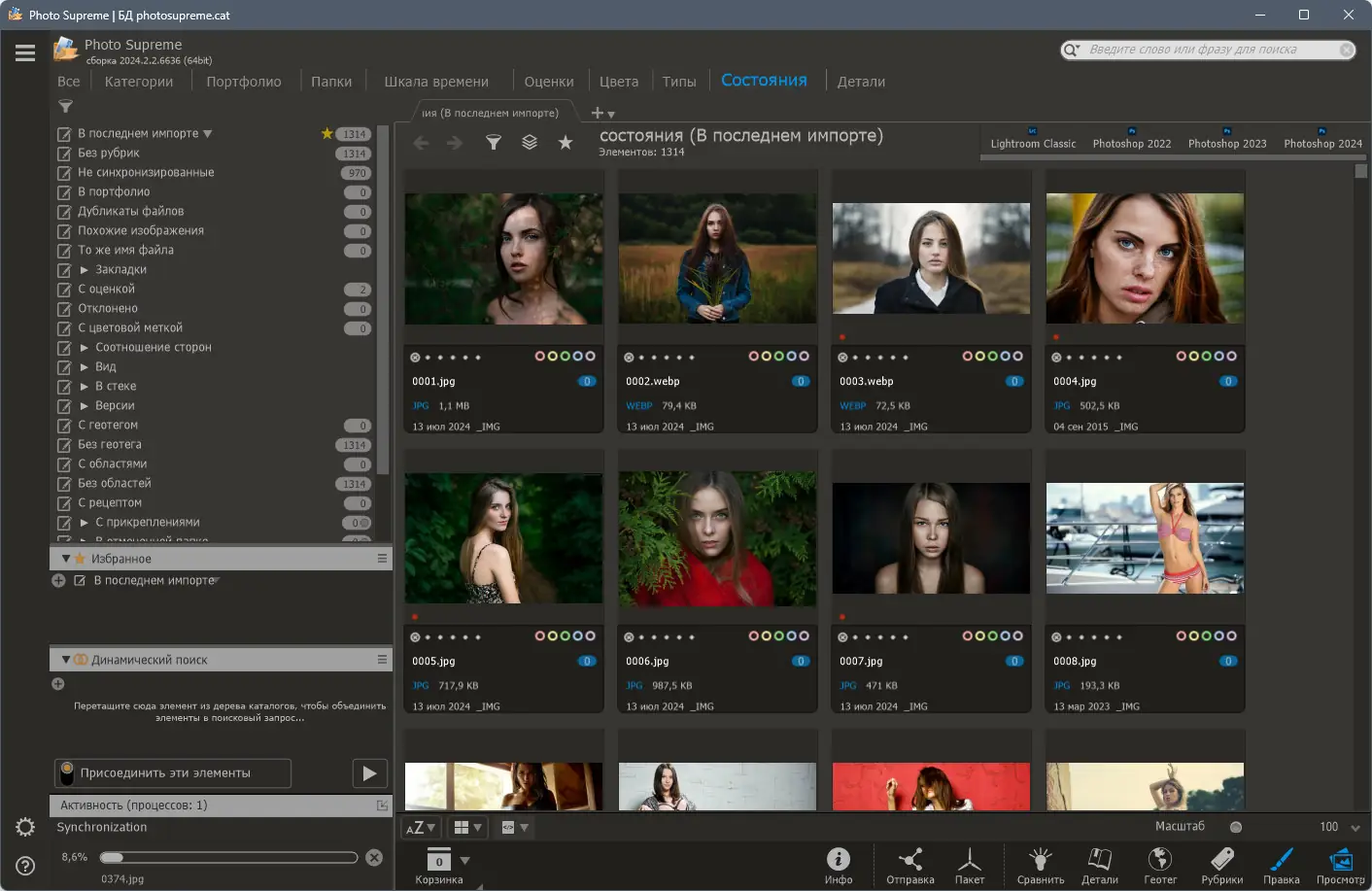 Photo Supreme — это мощная и удобная программа, предназначенная для владельцев цифровых фотокамер, которая позволяет эффективно организовать и управлять большими коллекциями изображений. Этот инструмент обеспечивает импорт фотографий с камер, их просмотр, создание каталогов, архивирование, а также редактирование и публикацию изображений. Благодаря богатому набору функций, Photo Supreme помогает пользователям быстро находить нужные фото, устранять дубли и распознавать лица, что значительно повышает эффективность работы с большим объемом графических файлов.