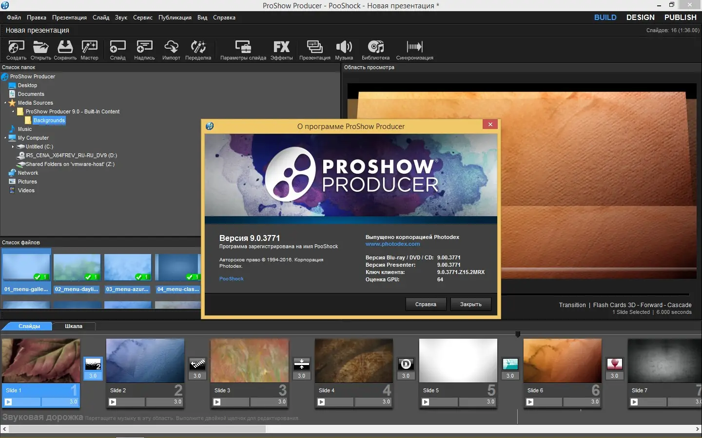 ProShow Producer – новая версия приложения для создания профессиональных презентаций, которая включает в себя сотни новых функций и обновленный интерфейс. Программа поддерживает работу со слоями и дает возможность использовать неограниченное число слоев для каждого слайда. Она обеспечивает работу с прозрачностью для файлов PSD, PNG, TIFF и GIF, а также предоставляет инструменты для применения масок слоя, эффектов перехода, градиентной и заливочной цветовой заливки. В редакторе доступны функции редактирования изображений, такие как повышение четкости, изменение контрастности и насыщенности цветов. Готовая презентация может содержать подписи, включая анимированные, и фоновую музыку. Проект можно сохранить в четырнадцати форматах, в том числе HD Video, Flash и QuickTime, что делает его универсальным средством для профессиональной презентационной деятельности.