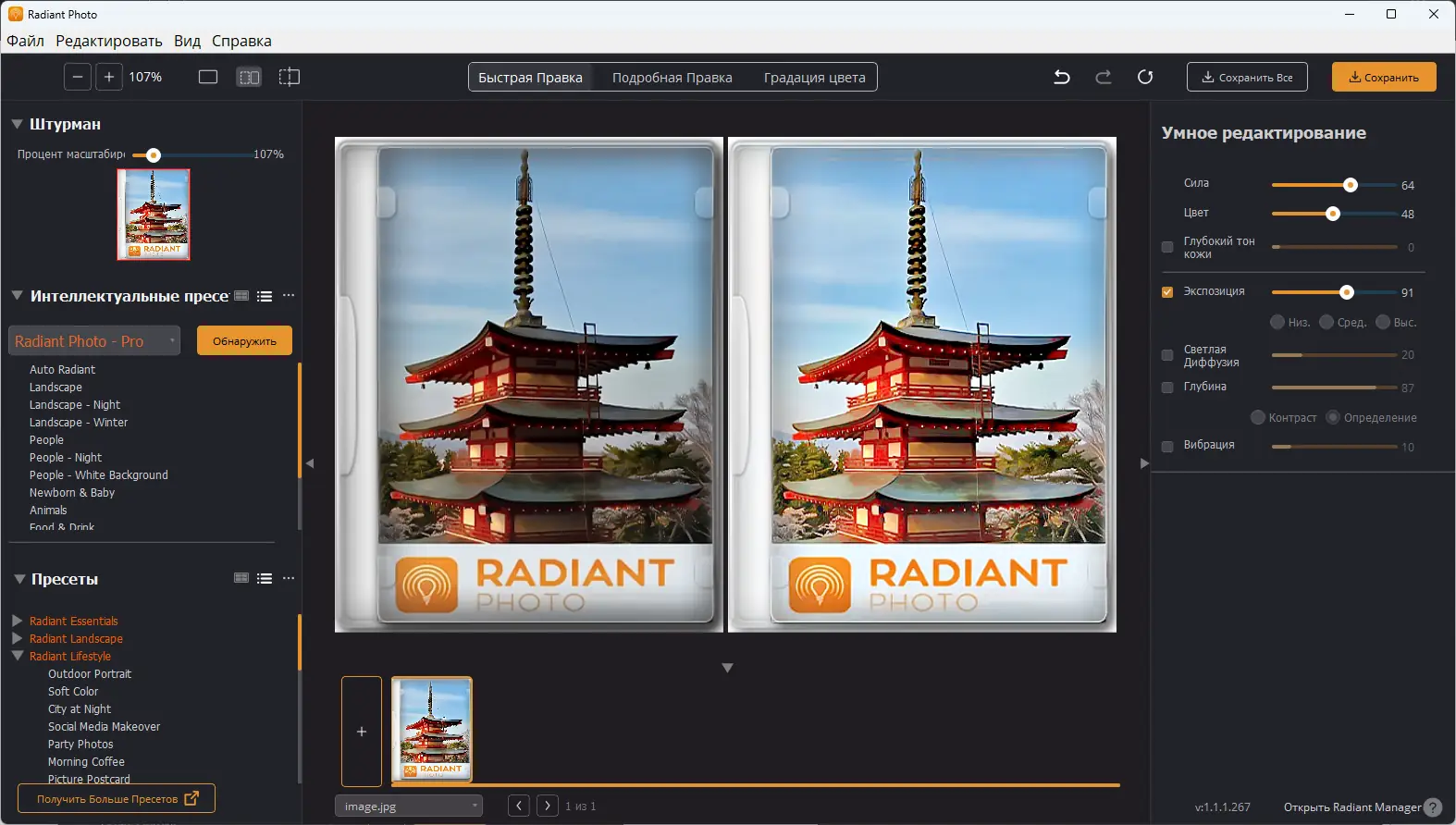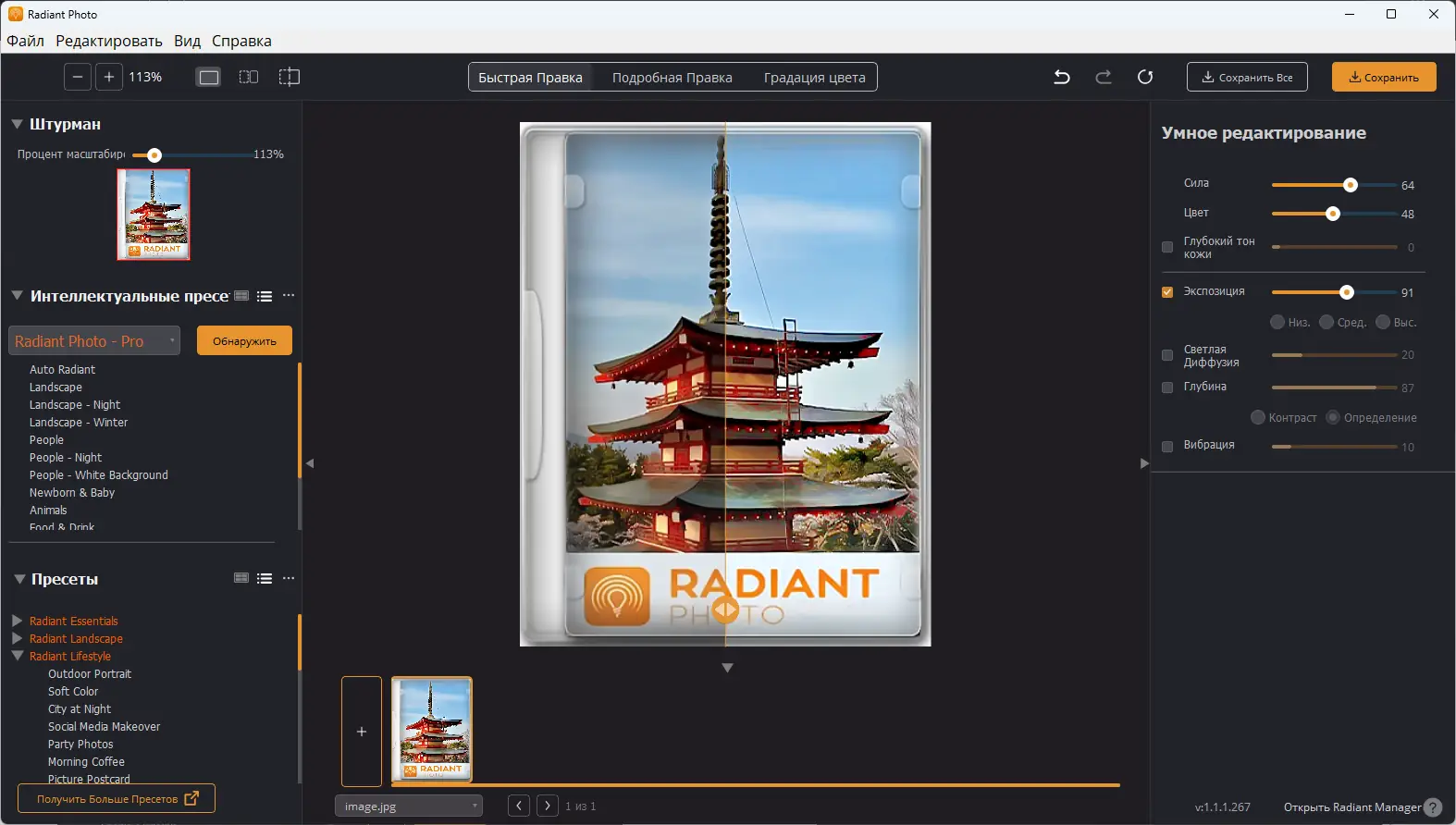 Эта программа обеспечивает широкий спектр возможностей для обработки фотографий, включая инструменты для настройки цвета, яркости, контрастности, насыщенности и других параметров. Она позволяет выполнять основной редактинг — обрезку, вращение и изменение размеров изображений, а также применять многочисленные фильтры и эффекты для создания уникального визуального стиля. Кроме того, Radiant Photo обладает функциями по организации фотографий, такими как создание альбомов, отметки и поиск по метаданным. Программа поддерживает работу как отдельно, так и в виде плагина для популярных редакторов — Photoshop и Lightroom, что делает её универсальным инструментом для обработки фото.