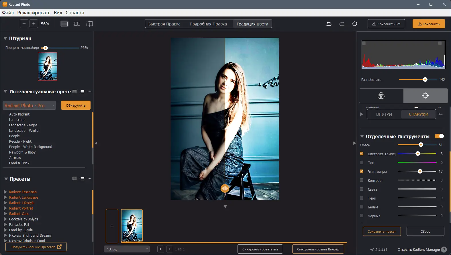 Radiant Photo — это универсальное решение для обработки цифровых фотографий. Программа предоставляет широкий набор инструментов для систематизации, редактирования и организации изображений. Пользователи могут изменять цветовые параметры, яркость, контрастность, насыщенность, а также применять фильтры и эффекты для создания уникальных визуальных решений. Поддержка работы с форматами RAW и облачными сервисами хранения позволяет максимально гибко управлять фотографиями. Обеспечивается неразрушающее редактирование, что позволяет сохранять исходные файлы без изменений и отменять любые действия. Возможность пакетной обработки ускоряет работу при необходимости корректировки большого количества изображений.