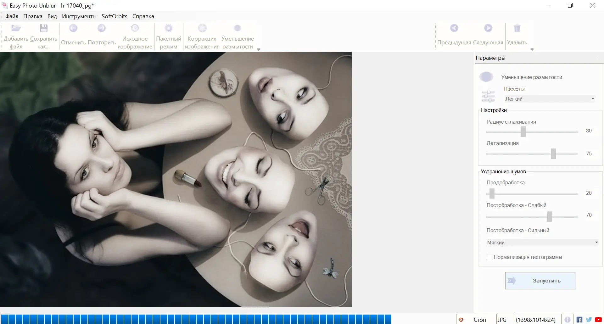 Если необходимо быстро восстановить качество множества фотографий, программа предоставит удобный и надежный инструмент для создания ярких, четких изображений, избавившись от дефектов, вызванных движением, дрожанием или неправильным фокусом.