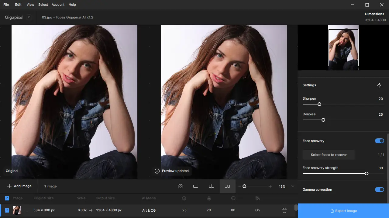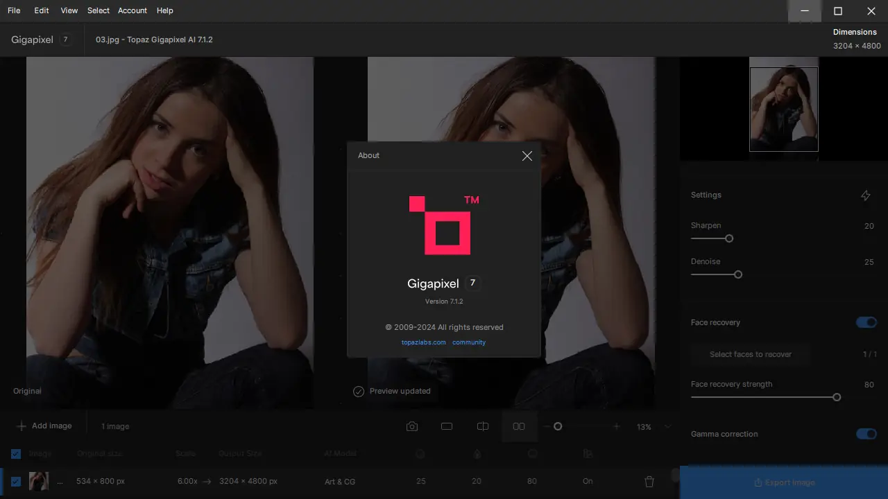 Topaz Gigapixel AI — это решение, основанное на технологии глубокого обучения, которое позволяет увеличивать разрешение изображений, заполняя недостающие детали и текстуры. В отличие от традиционных методов масштабирования, использующих простое добавление пикселей, эта программа способна восстанавливать мелкие детали, делая итоговое изображение максимально естественным и четким. Благодаря обучению на миллионах образцов, Gigapixel AI умеет уверенно работать с портретами, природными пейзажами, архитектурными объектами и компьютерной графикой, при этом избегая появления блоков и артефактов.