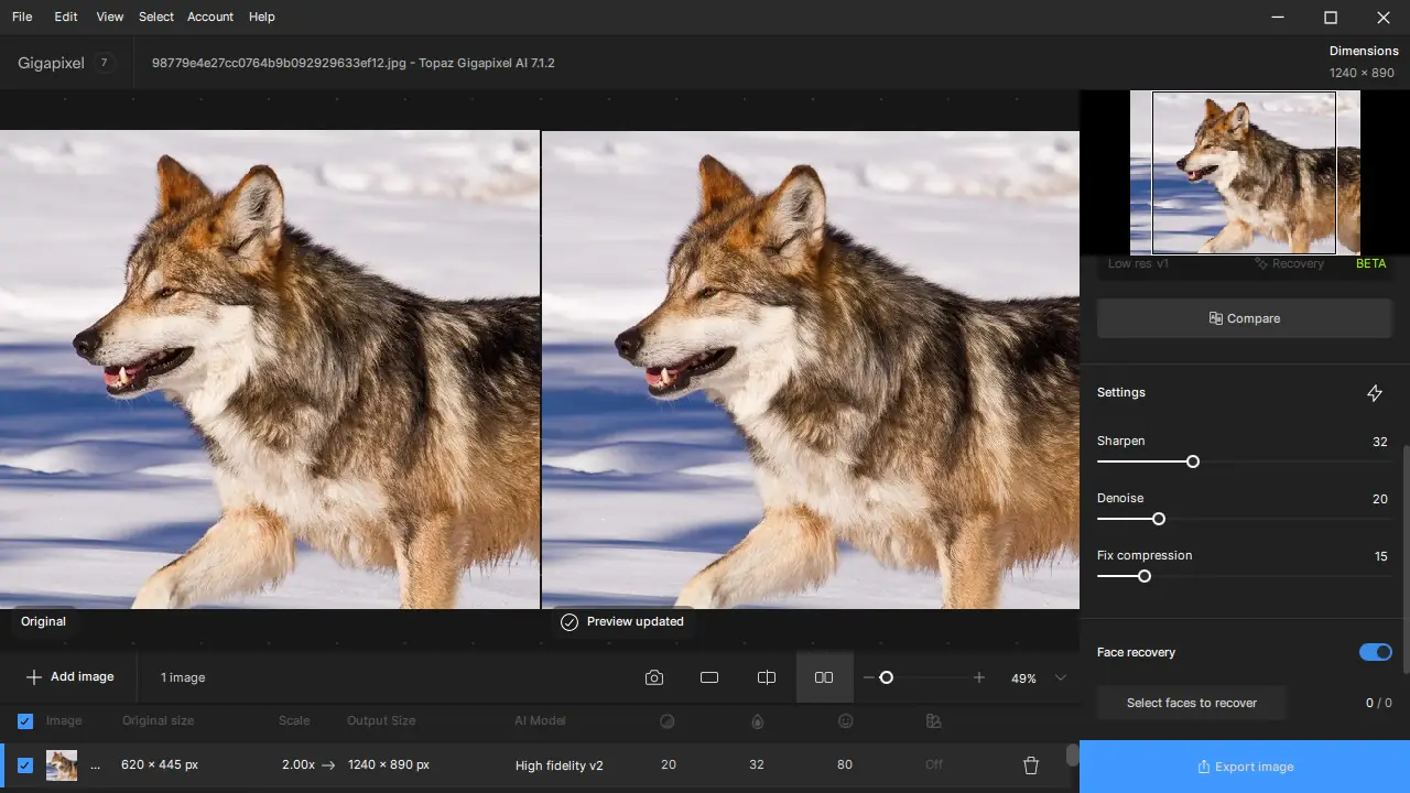 - Использование технологии Face Recovery AI для восстановления мелких деталей лиц при масштабировании.